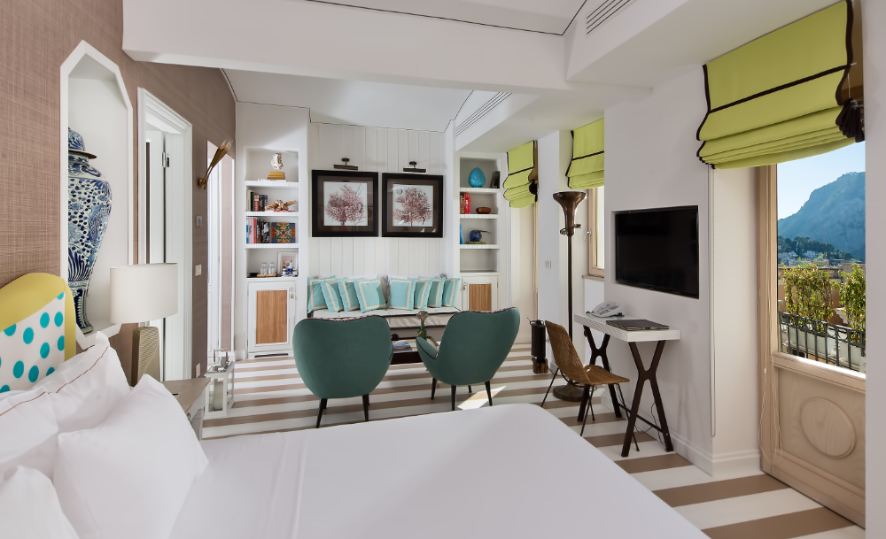 - One Bedroom Suite — оформленные в контрастных темах и отражающие стиль Капри в стиле ретро просторные, эклектичные и свежо оформленные люксы площадью около 70 кв.м, состоящие из спальни, отдельной гостиной комнаты, ванной комнаты с тропическим душем и/или ванной с видом на море и двумя раковинами из тосканского камня Сантафиора.