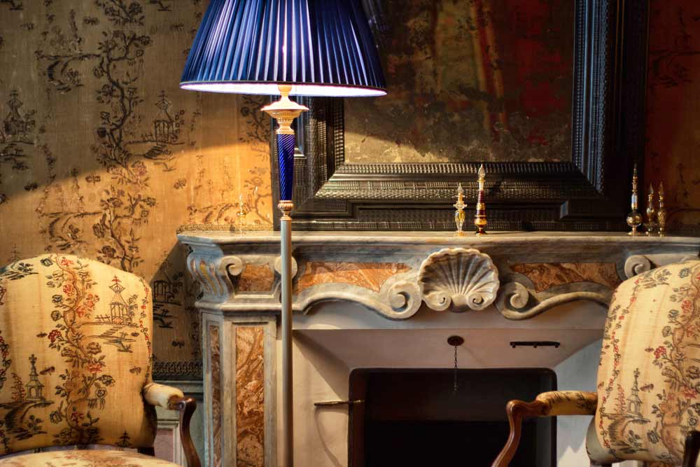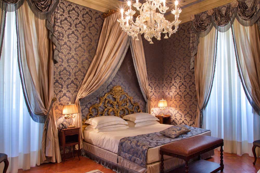 - Castle Luxury Suite — украшенный антикварными китайскими гобеленами роскошный люкс площадью 200 кв.м, с видом на сады, холмы Langhe и Альпы, состоящий из прихожей, спальни со старинной восточной обивкой, гостиной с историческими обоями, отделанной мрамором ванной комнаты.