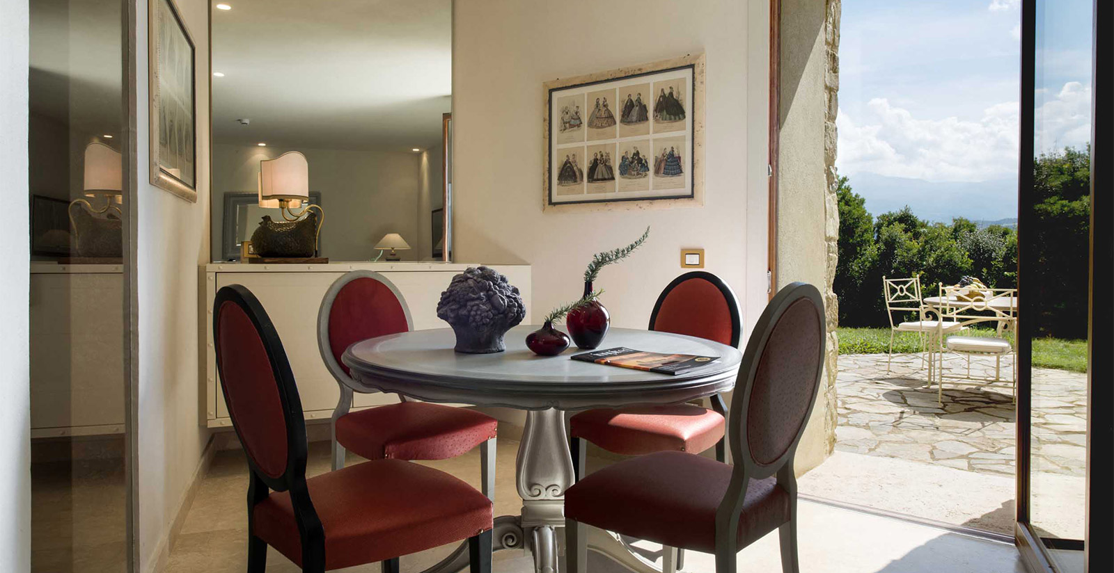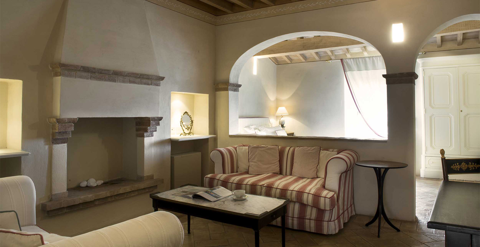 - Family Suite — изысканно оформленные семейные люксы площадью от 80 до 150 кв.м, с потрясающим видом на долину Валь д’Орча и виноградники, состоящие из двух спален, большой отдельной гостиной комнаты, одной или двух отдельных ванных комнат. Эти элегантные апартаменты обставлены старинной мебелью и отличаются такими традиционными тосканскими особенностями, как открытые стропила, сводчатые потолки, терракотовые полы и большие декоративные камины. Некоторые апартаменты расположены на двух уровнях.