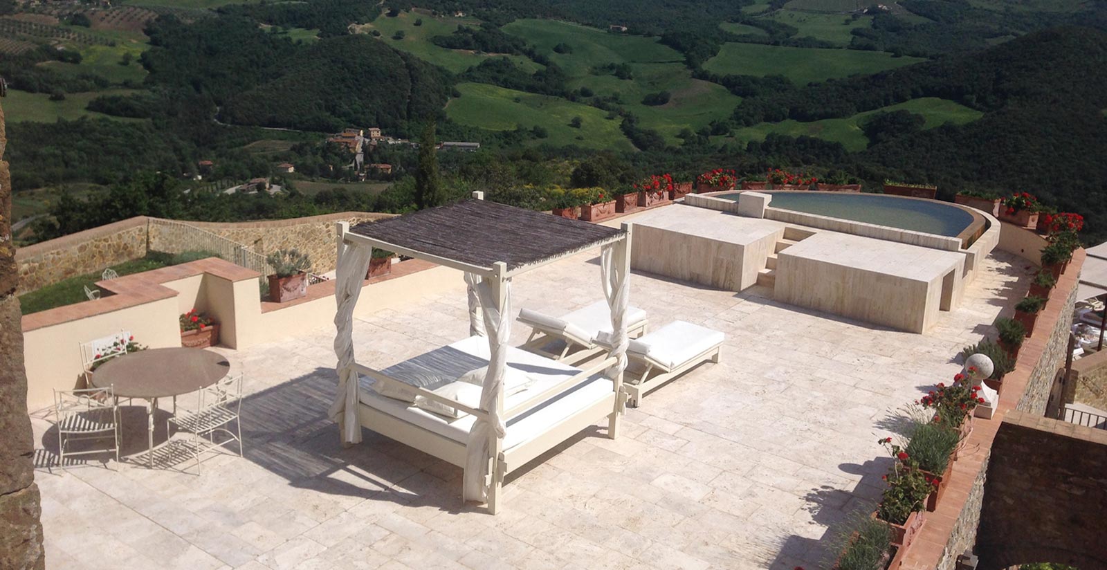 - Pool Terrace Suite — расположенный на первом этаже старинной южной башни замка люкс площадью 80 кв.м, оснащенный всеми удобствами, чтобы обеспечить вам невероятное пребывание. Элегантные интерьеры разделены между спальной зоной и большой гостиной. Флорентийская терракота, большой исторический декоративный камин, потолки с открытыми балками, панорамные окна в толстых стенах, классические декорации и стильная мебель приглашают вас пережить эмоции древней истории. Мраморная ванная комната оборудована двойной раковиной в моноблоке Travertine, душем и отдельной туалетной зоной. С большой террасы площадью 150 кв.м, оборудованной навесом, большим каменным столом и стульями, двумя удобными шезлонгами и зонтиком, открывается вид на виноградники Val d’Orcia. Есть также большой бассейн с пресной вулканической горячей водой для незабываемых моментов с лучшим видом на Тоскану 180°. Рассчитан для максимум 4 гостей.