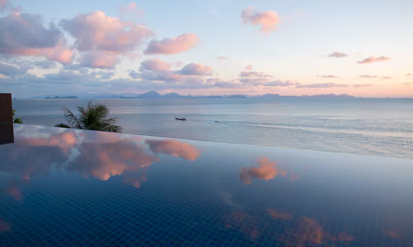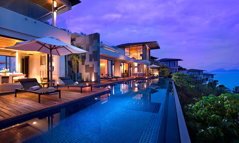 Остановитесь на вилле с отдельной террасой, 10-метровым панорамным бассейном, ванной комнатой в стиле спа с тропическим душем и панорамными видами с живописных склонов холма, спускающегося к белоснежному песчаному пляжу Сиамского залива.