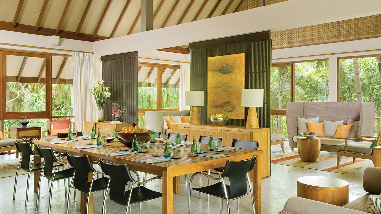 План - Two-Bedroom Oceanfront Bungalow – Partial Sea View — расположенные на северной стороне острова просторные бунгало площадью 287 кв.м плюс 340 кв.м открытой площади, с видами на окружающий сад и океан, состоящие из двух соединенных коридором спален, одна из которых с одной большой двуспальной кроватью King и одной детской кроваткой, а вторая — с двумя кроватями Twin, просторной гостиной комнаты с двумя диванами-кроватями, двух полноценных ванных комнат, двух душевых на открытом воздухе во дворе, меблированной террасы со столовой зоной на открытом воздухе, собственного бассейна.