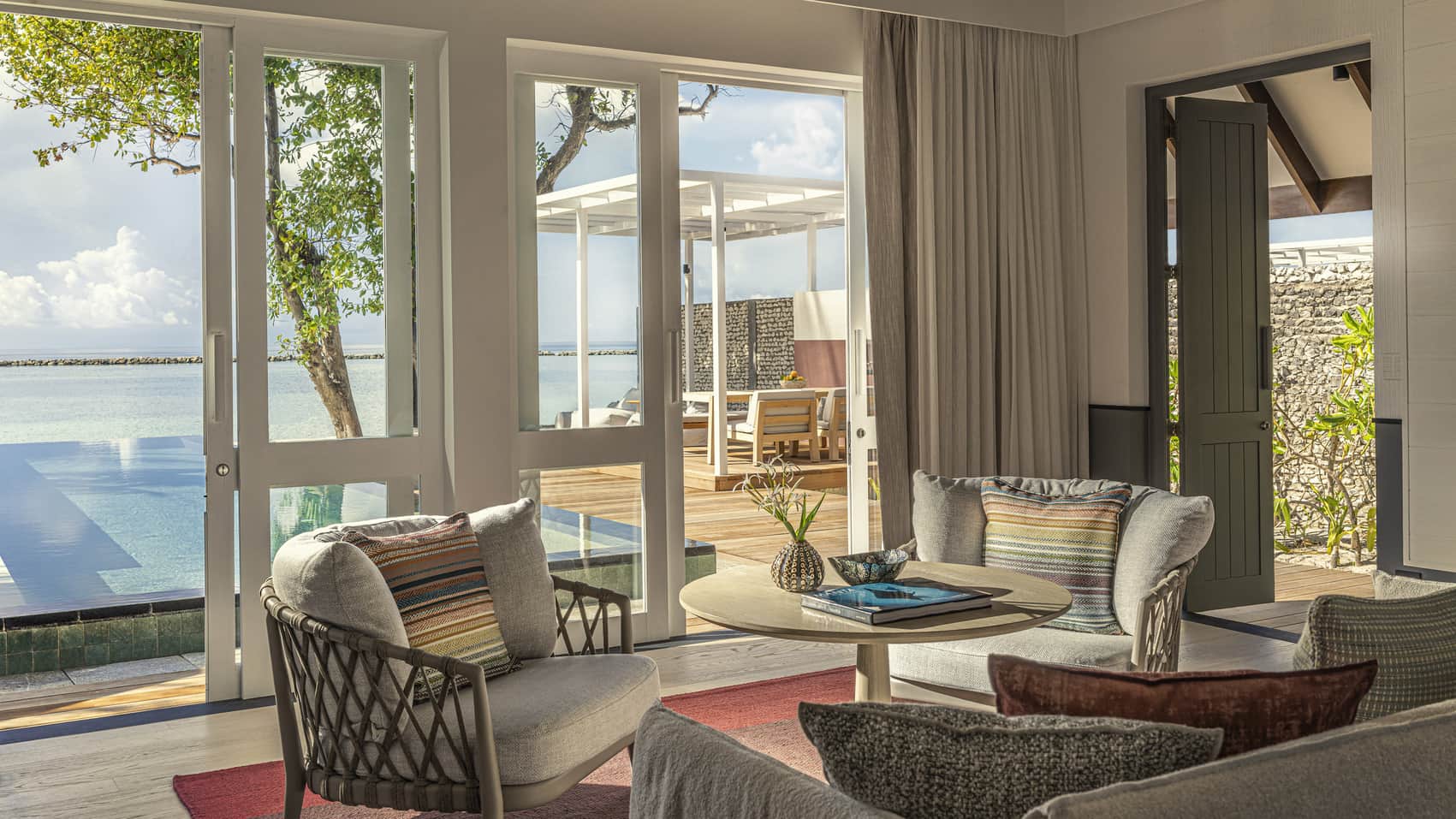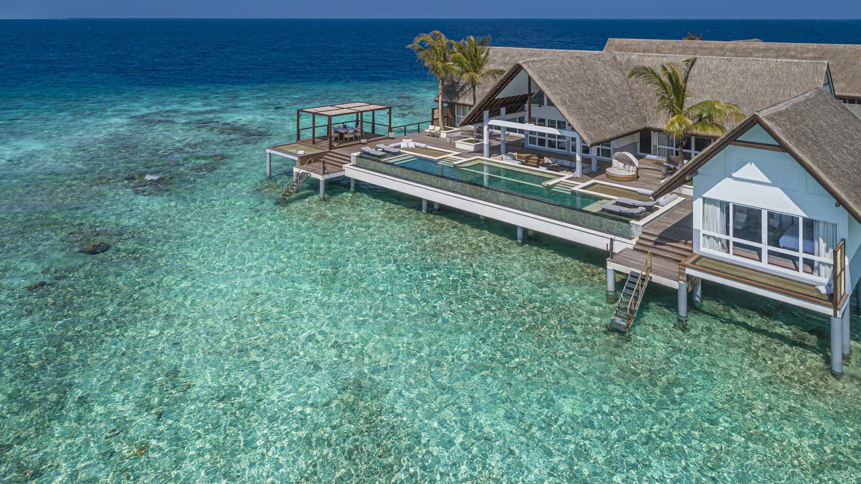 План - Water Villa with Pool – Partial Sea View — расположенные на северо-западной оконечности острова водные виллы площадью 90 кв.м плюс 183 кв.м открытой площади, с прямым доступом к лагуне по ступеням, состоящие из просторной спальни с одной большой двуспальной кроватью King, большой гостиной с диваном-кроватью, ванной комнаты с ванной, душа на открытом воздухе, меблированной террасы со столовой зоной на свежем воздухе, кушеткой и качелями, мансарды с частичным видом на океан, частного пейзажного 12-метрового бассейна. Есть также надводная сеть, на котором можно отдыхать.