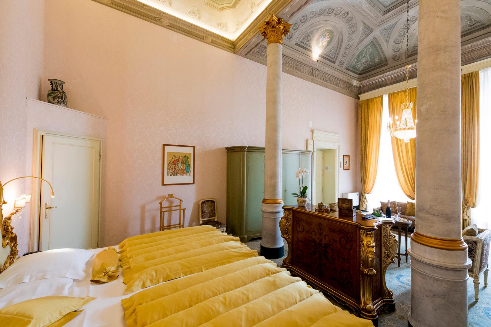 Потолки и кессоны в большинстве покрыты фресками с цветочными мотивами в игре розового и серого цветов. Гость останется, без сомнения, очарованным обоями и обивкой тех времен, во французском стиле, античными персидскими коврами, хрусталем люстр из Мурано, мебелью в имперском, неоклассическом стиле и стиле Либерти… и далее от внутренней парадной лестницы из мрамора, лепных колонн, великолепных d’oeil…