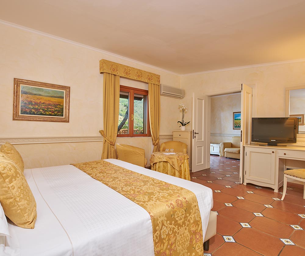 - Suite — люксы площадью 45 кв.м с восхитительным видом на море — самые эксклюзивные номера гостиничного комплекса, рассчитанные на гостей, которым нравится позволять себе все самое лучшее. Выдержанные в средиземноморских оттенках люксы состоят из спальни, отдельной гостиной комнаты, двух отделанных мрамором и керамикой из Виетри ванных комнат с гидромассажной ванной, большой террасы со столом и стульями. Гостям люксов предлагаются зонты на частном пляже в первом ряду непосредственно у моря. Рассчитаны для максимум 3 гостей.