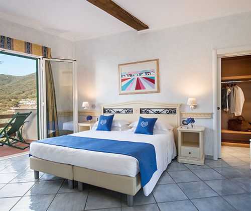 - Family Room — семейные номера площадью 35 кв.м, представленные в вариантах Classic Family Room и Sea View Family Room. Номера состоят из основной спальни, второй спальни поменьше, с раздельными кроватями, для детей, ванной комнаты, меблированного балкона. Элегантная обстановка и нежные средиземноморские оттенки придают номерам умиротворенную атмосферу. Здесь вы будете отдыхать, наслаждаясь видом на сад, усаженный средиземноморской растительностью и на потрясающе красивое море делла Биодола. Рассчитаны для максимум 4 гостей.