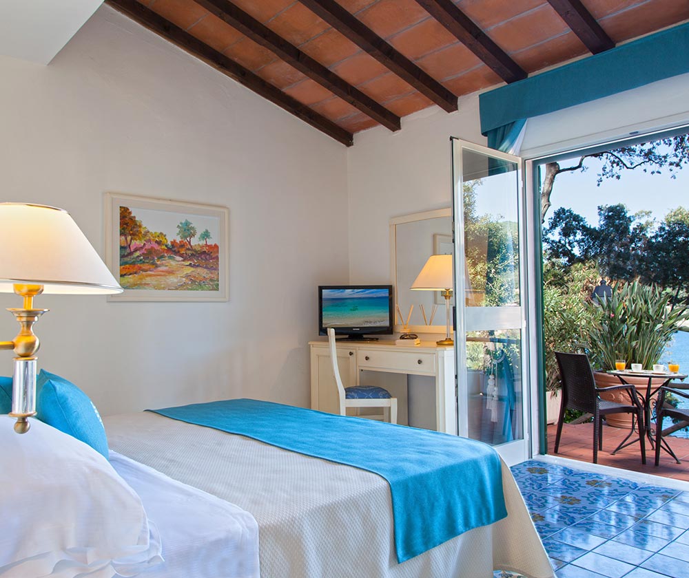 - Sea View Rooms — выдержанные в оттенках природы Средиземноморья номера площадью 20 кв.м, с панорамным видом на море, с оригинальными терракотовыми полами, состоящие из спальни с небольшой гостиной зоной, ванной комнаты, частной террасы со столом и стульями, с которой вы сможете любоваться уникальным видом на бухту делла Биодола в полном уединении. Рассчитаны для максимум 3 гостей.