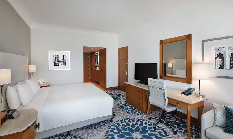 Рассчитаны для максимум 3 гостей; 2 взрослых и 1 ребенка. - King Corner Alcove Room With Sea View — угловые номера с панорамными окнами с видом на Персидский залив, состоящие из спальни с одной двуспальной кроватью King, уютно обставленной гостиной зоны, рабочей зоны с письменным столом, отдельной гардеробной, ванной комнаты, балкона.