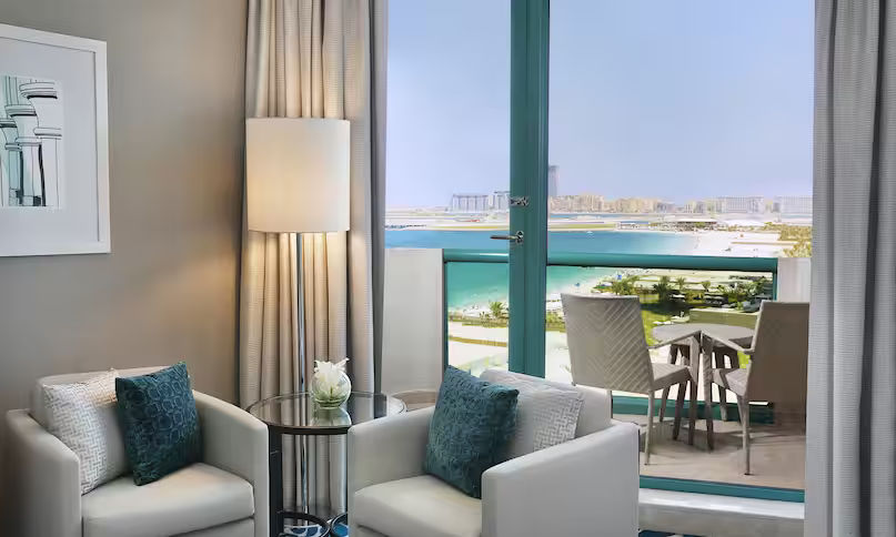 Рассчитан для максимум 4 гостей; 2 взрослых и 2 детей. Раскладная кровать предоставляется по запросу. - Family Suite With Sea View — просторный семейный люкс площадью 69 кв.м, с большими окнами от пола до потолка с видом на Персидский залив, состоящий из спальни, отдельной гостиной комнаты, ванной комнаты, двух частных балконов.