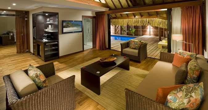 - King Garden Pool Suite роскошные виллы площадью 159 кв.м, с частной террасой и бассейном. Вилла оформлкена в традиционном полинезийском стиле с деревянным полом и имеет отдельную жилую зону с удобным диваном и комфортабельную спальню.