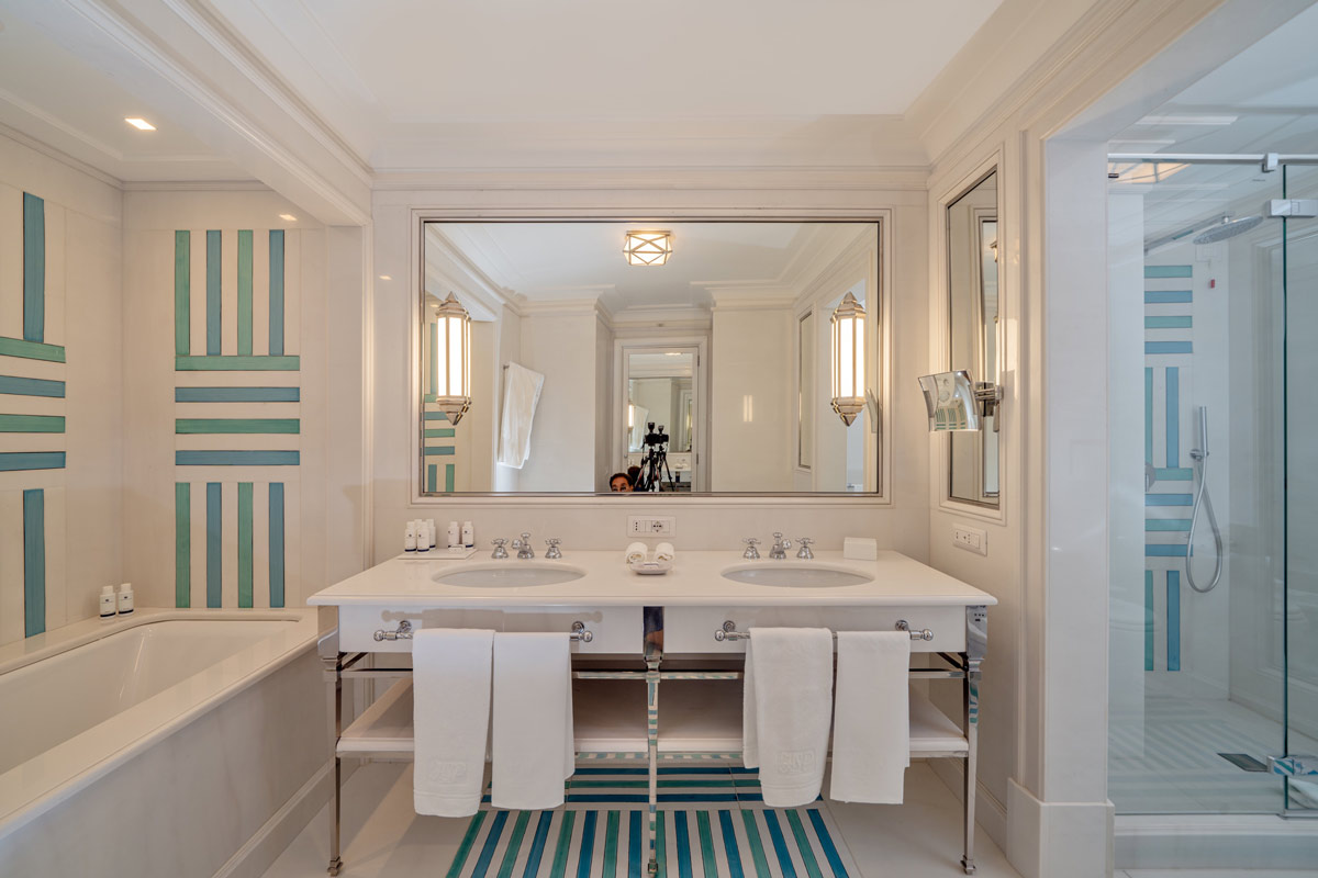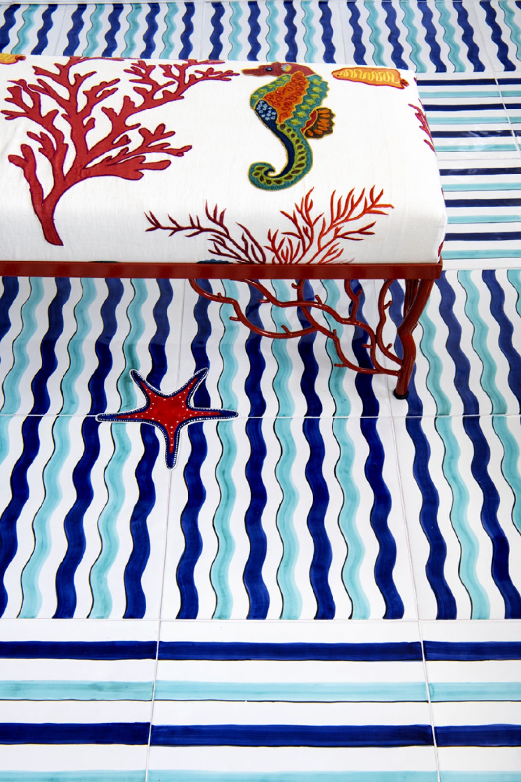 Недавно отремонтированный и переоформленный с использованием игривой морской тематики Фаустой Гаэтани (Fausta Gaetani) и ее командой архитекторов, люкс Вирджиния — это роскошное удовольствие для тех, кто хочет побаловать себя дополнительным пространством и стилем. Морские звезды, инкрустированные зеркалами, красочные морские ежи, вырезанные вручную в глазурованной терракотовой плитке для пола, стилизованные под нежные волны, водно-зеленые и аквамариновые ткани, синее выдувное стекло и гигантские люстры из ракушек — все это вызывает в воображении образы прибрежной географии.