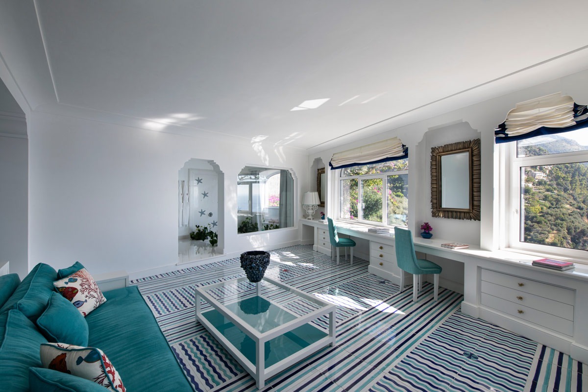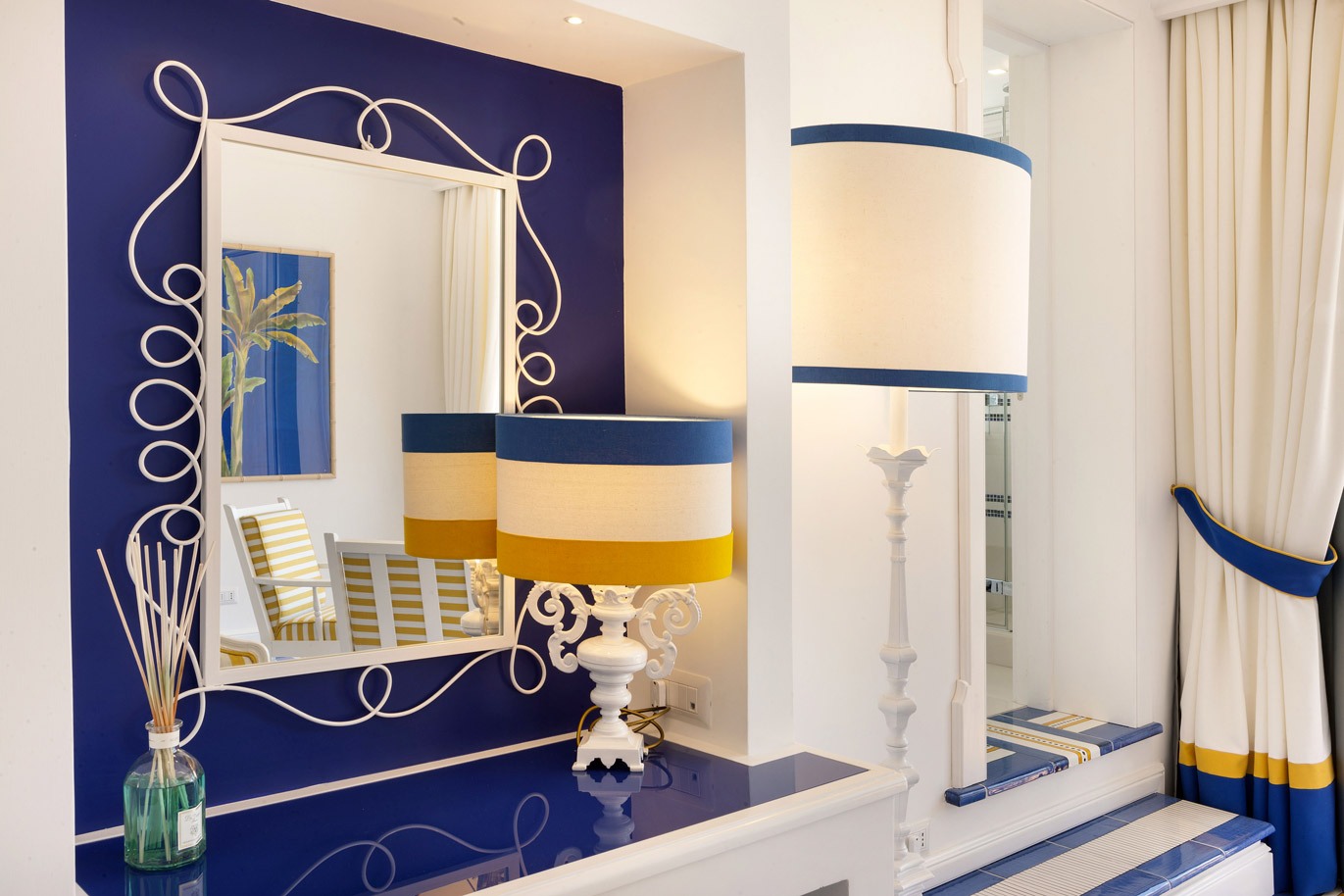 Каждый из номеров имеет уникальный дизайн, разработанный Фаустой Гаэтани (Fausta Gaetani) и включает в себя особые элементы, керамику, итальянский мрамор и все удобства для роскошного проживания. Большие панорамные террасы обставлены столами, стульями и шезлонгами. - Prestige Rooms — роскошные, просторные и удобные номера площадью около 80 кв.м, состоящие из спальни с очень большой кроватью, просторной гостиной зоны с уникальной мебелью, отделанной итальянским мрамором или терракотовой плиткой ручной работы местных мастеров большой ванной комнаты с ванной и широкой душевой кабиной, большой меблированной столом, стульями и шезлонгами террасы с потрясающим видом на побережье Средиземного моря.