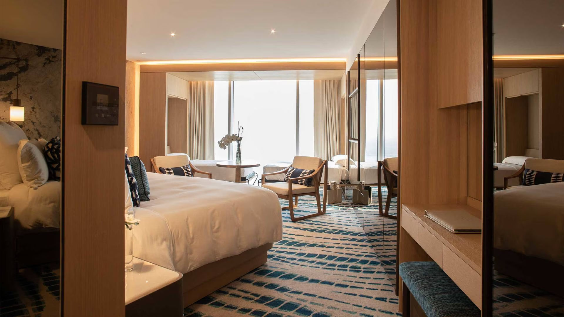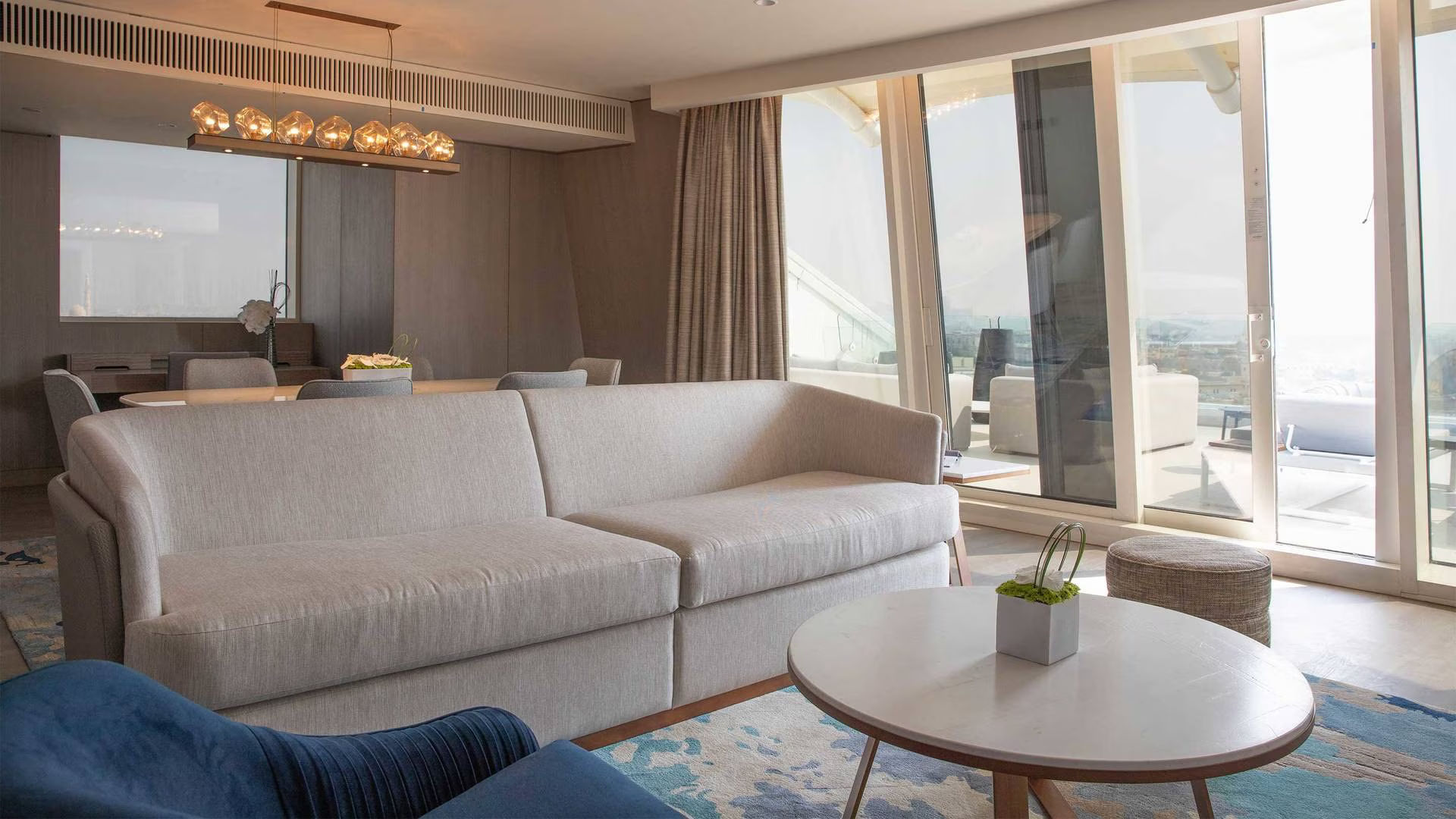 Современные тона и комфортабельный стиль придают этому люксу манящее спокойствие, а из окон от пола до потолка открывается великолепный вид на Персидский залив.