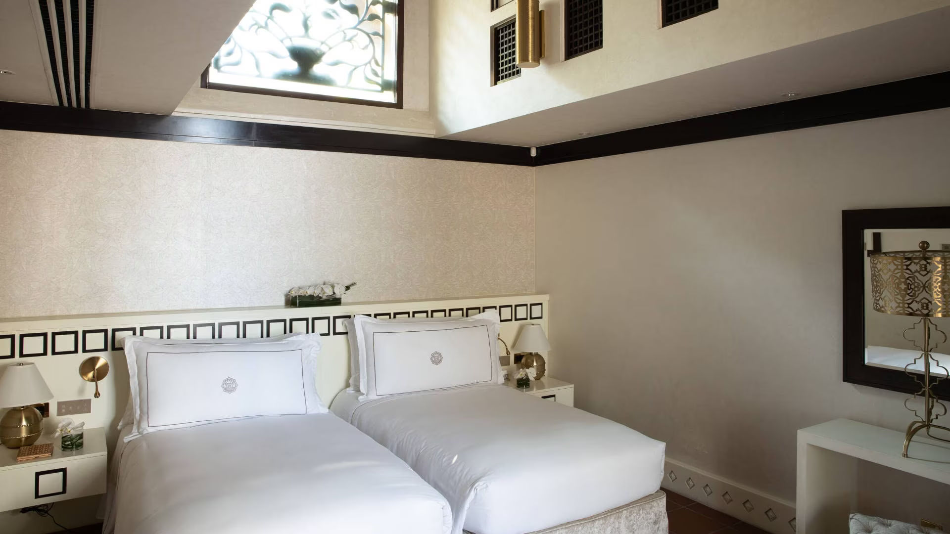 Рассчитан для максимум 4 гостей или 3 взрослых и 3 детей в возрасте до 11 лет. Детские кроватки предоставляются по запросу. - Al Marsa Suite — роскошный люкс, состоящий из красивой спальни с одной двуспальной кроватью King bed, отдельной просторной гостиной комнаты со столовой зоной, буфетной, гардеробной, роскошной ванной комнаты с ванной и отдельной душевой кабиной, гостевой туалетной комнаты, частной меблированной террасы с выходом на частный пляж.