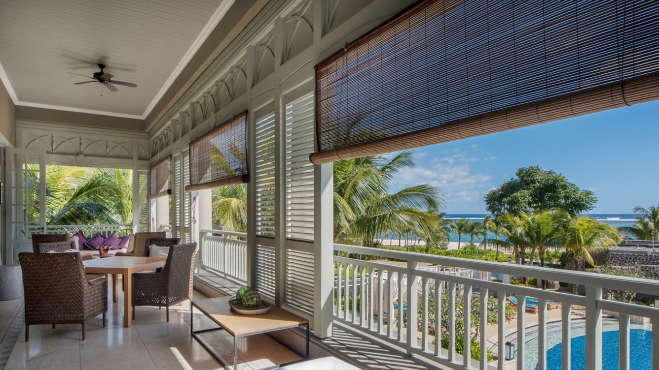 Рассчитан для максимум 3 гостей. Возможны 2 детские кроватки. - Le Morne Balcony Suite — роскошные люксы площадью 150 кв.м, с видом на океан, состоящие из спальни с кроватью King-size, отдельной просторной гостиной комнаты с диваном-кроватью, рабочей зоны с письменным столом, гардеробной, отделанной мрамором большой ванной комнаты с гидромассажной ванной, отдельной душевой кабиной и двумя раковинами, хаммама, большого частного меблированного балкона.
