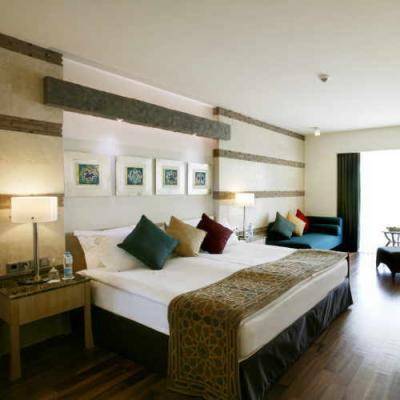- С номера Deluxe Room открывается захватывающий вид на море и поля гольфа. Номер состоит из спальни, уютной гостиной с письменным столом, мраморной ванной с отдельной душевой кабиной, феном, балкона.