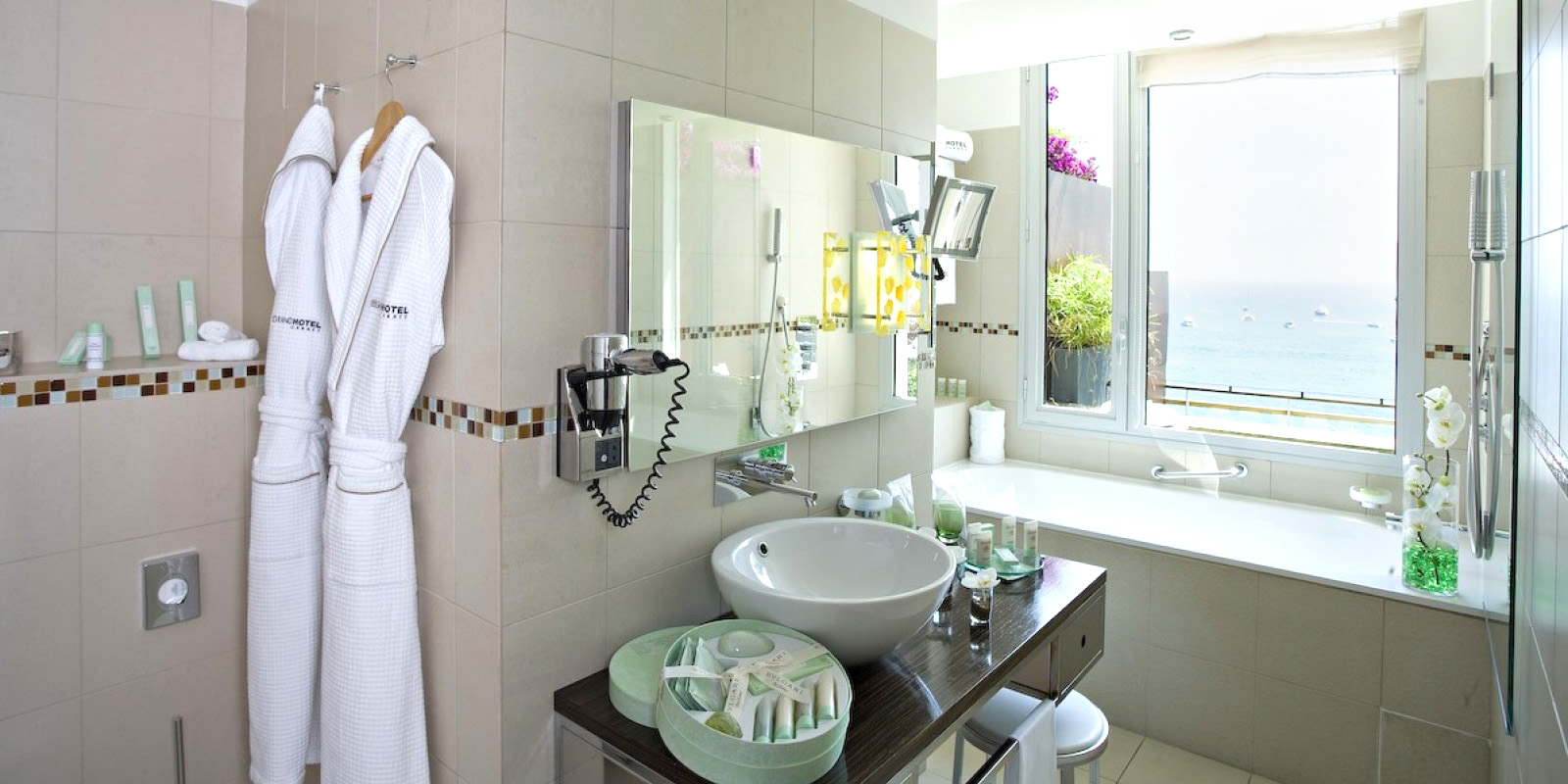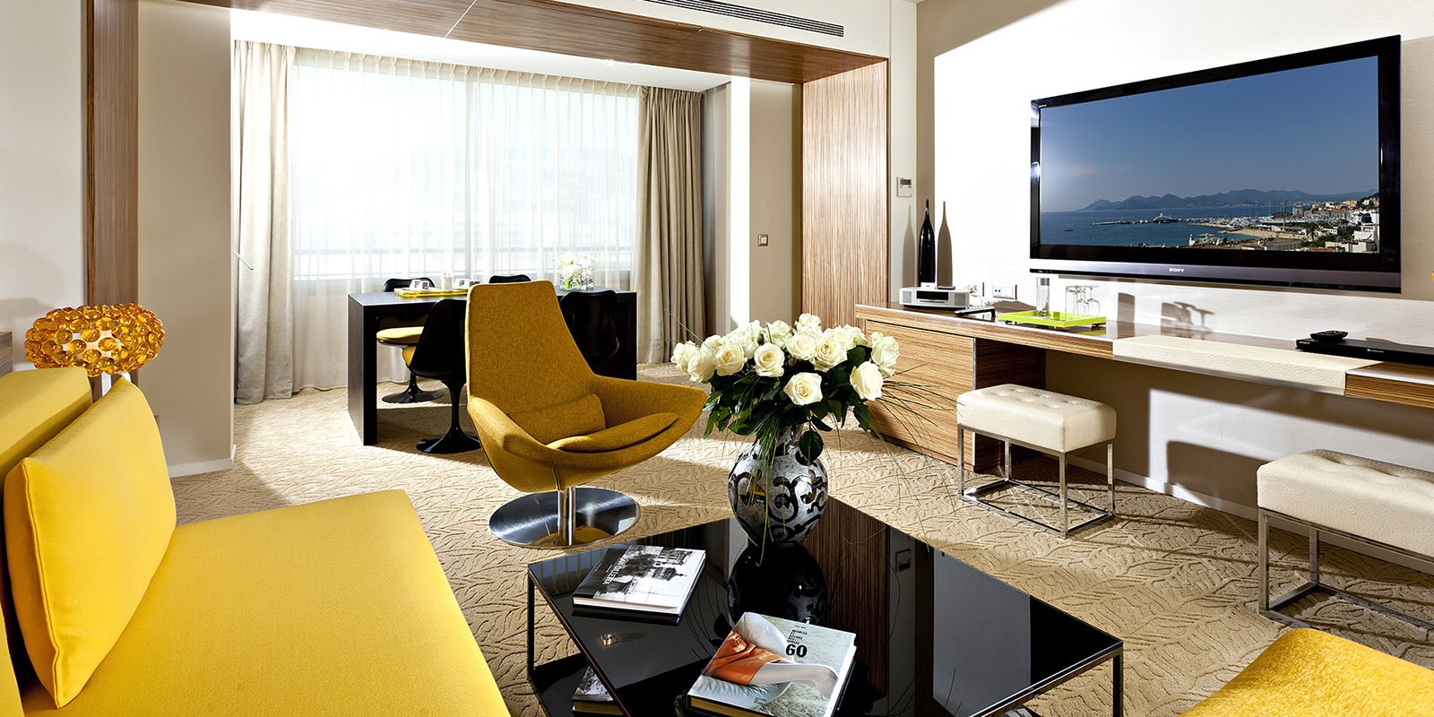 - Sea View Suites — апартаменты площадью 85 кв.м, с видом на море. Поднимитесь на залитую солнцем высоту 11-го этажа отеля. Из высоких панорамных окон гостиной и спальни открывается великолепный вид на лазурную синеву Средиземного моря. Словно полотно художника, море занимает все пространство — настоящий спектакль, которым можно неустанно наслаждаться днем и ночью. Вдоль спальни и гостиной вытянулась терраса. Вся бухта Канн простирается перед вами как на ладони, от Леринских островов до квартала Сюке. Ванная комната оснащена душем и ванной. Современное оборудование и дизайнерская мебель в спальне и гостиной позволят вам насладиться приятными минутами отдыха.