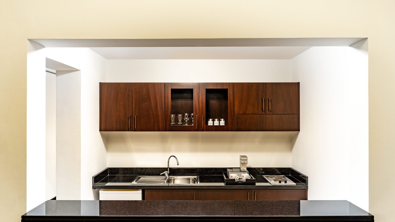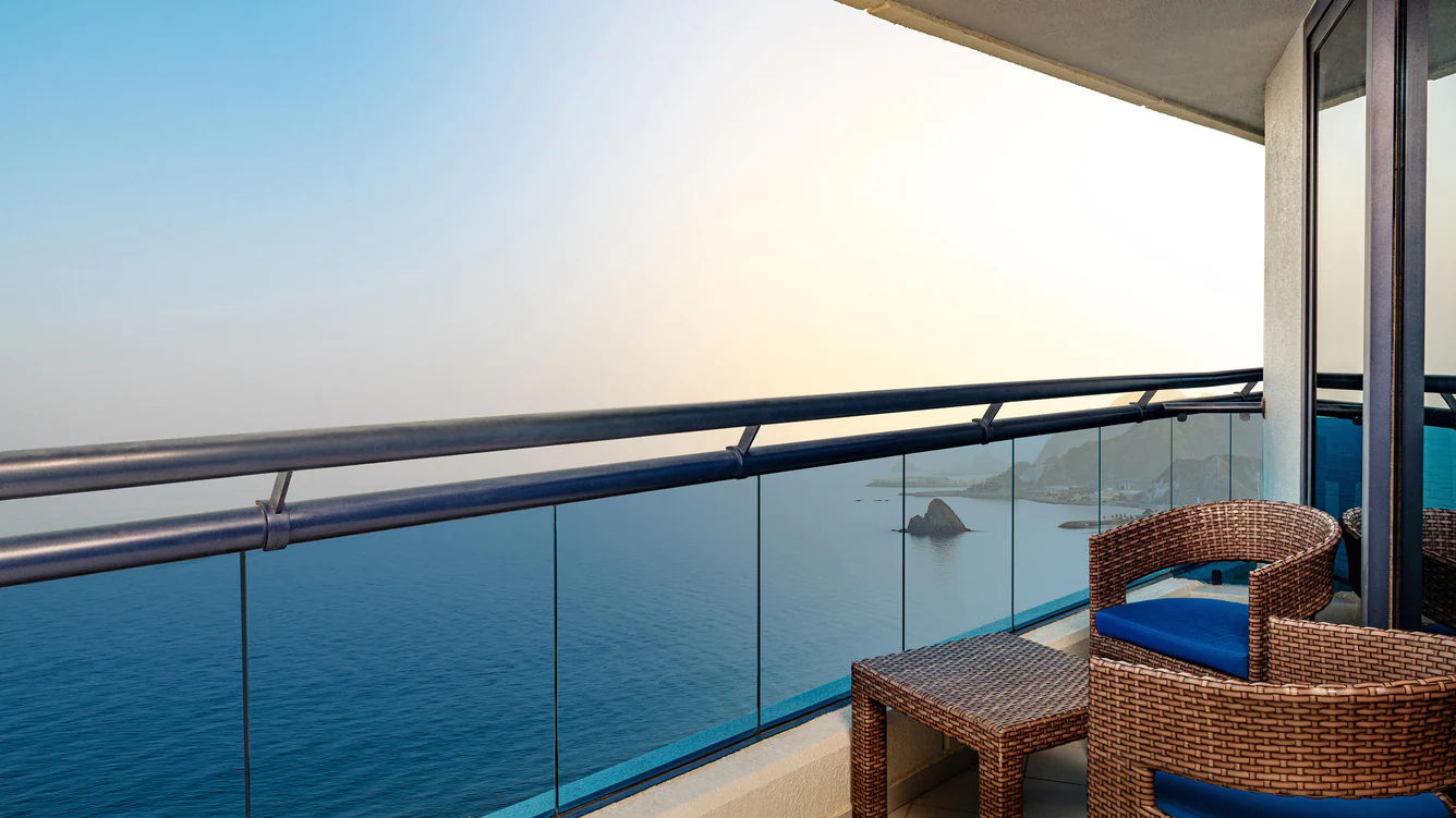 Рассчитаны для максимум 3 гостей; возможны 1 раскладная кровать, 1 детская кроватка. - Club lounge access, 1 Bedroom Executive Suite, 1 King, Ocean view, Balcony — представительские люксы площадью 97 кв.м, с великолепным видом на Индийский океан и Хаджарски горые, состоящие из спальни с одной кроватью King с наматрасником и одеялом, отдельной элегантной гостиной комнаты, столовой зоны, мини-кухни с холодильником, дизайнерской кофемашиной, буфета, рабочей зоны с письменным столом и эргономичным стулом, гардеробной, отделанных белым мрамором двух ванных комнат с ванной, отдельной душевой кабиной и биде, частного Г-образного балкона и террасы с гостиным уголком и шезлонгами.