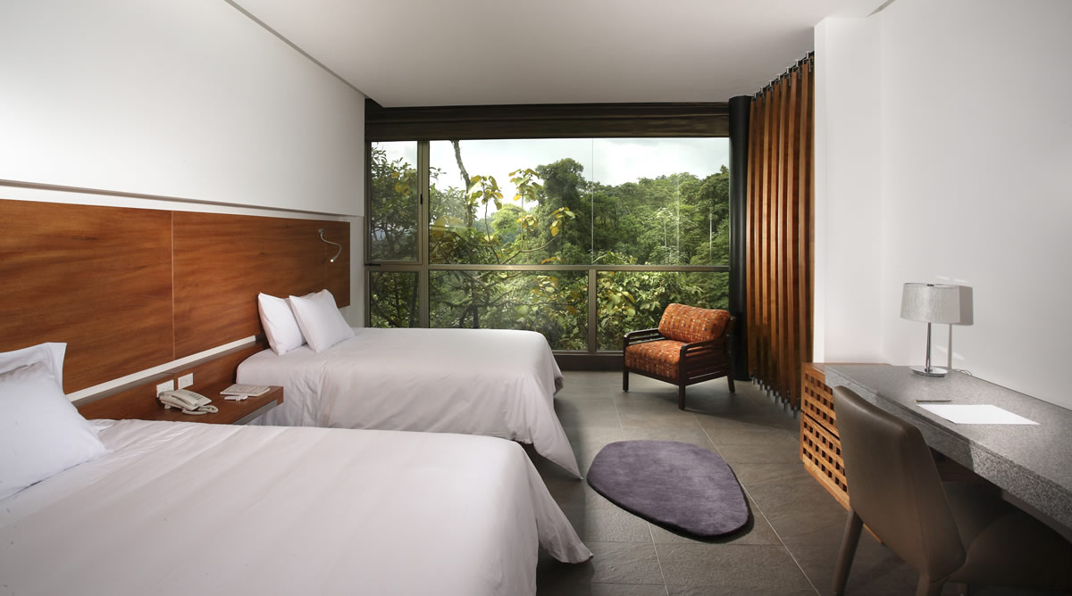 Здание Mashpi Lodge построен из стекла, дерева и стали с использованием новейших технологий. Его современный дизайн и минималистский декор не конкурируют с окружающей изумительной природой, а позволяют гостям полностью раствориться в ней. Это настоящий “кокон”, где можно расслабиться и отдохнуть, продолжая наслаждаться потрясающими видами облачного леса. Окна в отеле, как в общих зонах, так и в номерах – от пола до потолка.