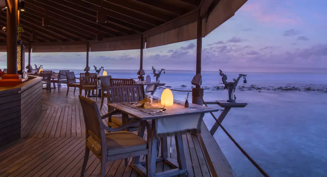 Ресторан открыт на обед с 12:30 до 14:30 и на ужин — с 18:30 до 22:00. - Baan Huraa — расположенный на окраине рифа ресторан тайской кухни. Прогуляйтесь по лагуне и войдите в традиционный тиковый дом на сваях, волшебным образом освещенный закатным сиянием. С блюдами, предназначенными для совместного использования, как в Таиланде, выберите из множества деликатесов со всего королевства — кисло-острые салаты с северо-востока, горячие кокосовые карри с юга, любимые блюда Центральных равнин в сопровождении ароматного риса с жасмином. Освежите вкус традиционными десертами, такими как клейкий рис и манго или бананы, приготовленные в кокосовом молоке.