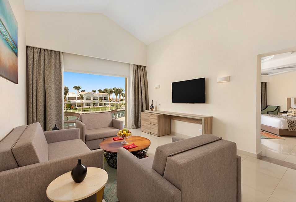Рассчитаны для 2 взрослых и 2 детей. - Junior Suite Pool View — потрясающие полулюксы площадью 45–50 кв.м, с видом на великолепные бассейны курорта, спальни с одной роскошной кроватью King-size или двумя удобными односпальными кроватями Twin, отдельной гостиной комнаты, стильной ванной комнаты с душевой кабиной, частного меблированного балкона.