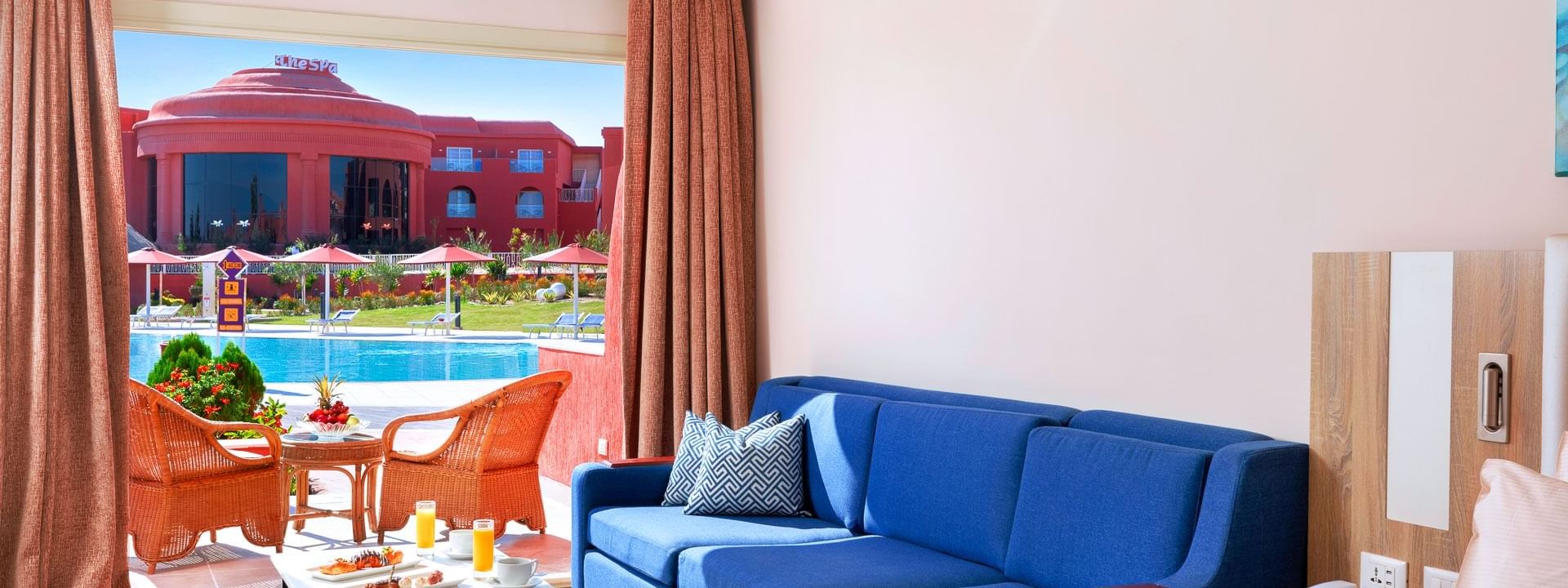 Рассчитаны для максимум 5 гостей; доступна детская кроватка. - Deluxe Swim Up Room — расположенные у бассейна уникальные номера площадью 45 кв.м, состоящие из спальни с одной кроватью King-size или двумя односпальными кроватями, уютно обставленной гостиной зоны, ванной комнаты с ванной и комбинированным душем, частной отдельной террасы с прямым выходом к бассейну.