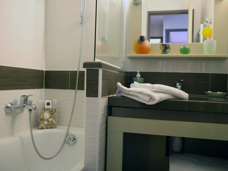 - Standard Apartment — 1/2 bedroom apartment for 6/7 people — Sea view — апартаменты площадью 37-42 кв.м с 1/2 спальней для 6-7 человек, с видом на море. 1 спальня с одной двуспальной кроватью; 1 спальный альков с двумя двухъярусными кроватями; 1 гостиная с тахтой с выдвижной кроватью (рекомендуется для детей), раскладной кроватью; полностью оборудованная кухня открытого плана; 1 ванная комната с ванной, душевой кабиной; 1 туалет.