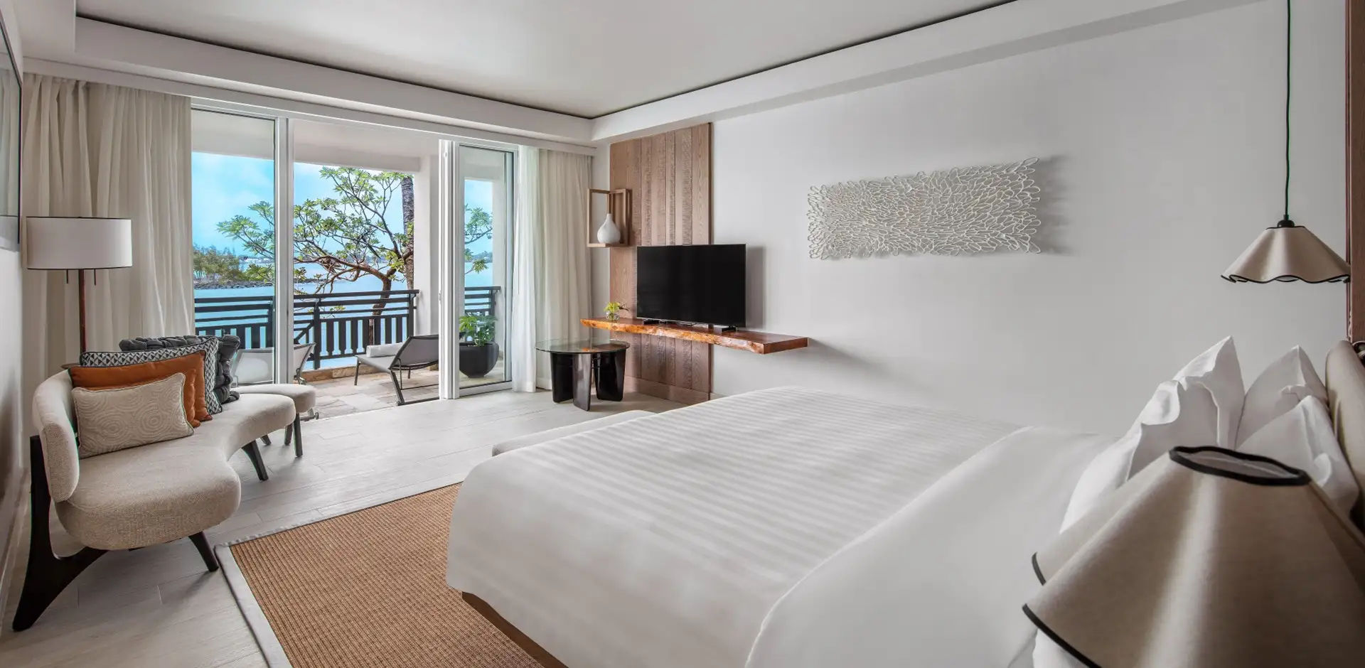 Интерьеры номеров, вдохновленные красотой и духом Маврикия, переносят вас в природный ландшафт острова с помощью спокойных цветов, элегантных фотографий и современного маврикийского искусства.