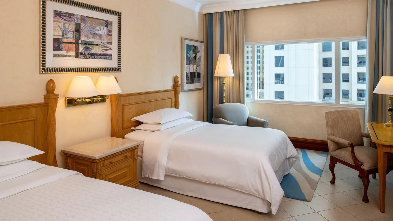 Рассчитаны для максимум 3 гостей; возможна 1 раскладная кровать или 1 детская кроватка. - Deluxe JBR View Guest Room, 2 Twins — номера площадью 36 кв.м, с прекрасным видом на пляж Jumeirah и променад, состоящие из спальни с двумя кроватями Twin с пуховыми одеялами, небольшой гостиной зоны, рабочей зоны с письменным столом, отделанной мрамором ванной комнаты с совмещенной ванной и душем и биде.