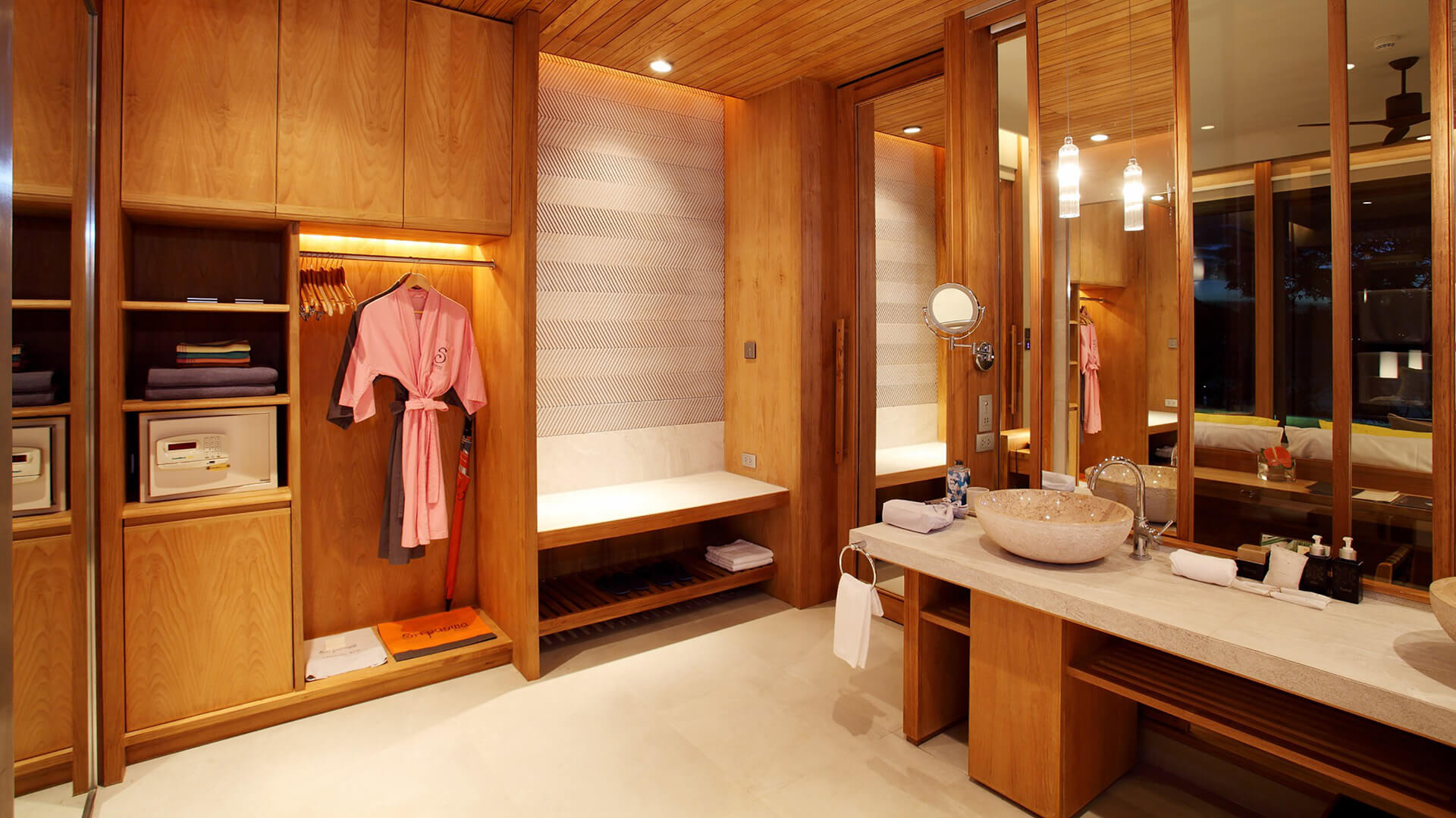 Оформленная в тропическом современном стиле, как внешняя, так и внутренняя отделка были выполнены по высочайшим стандартам и изготовлены на заказ с учетом естественных контуров мыса Панва. - 1 Bedroom Family Suite Partial Ocean View — семейные люксы площадью около 190 кв.м, с частичным видом на океан. Для роскошного и стильного проживания под одной крышей семейные люксы с одной спальней удобно расположены вдоль Западного полуострова, откуда открывается захватывающий вид на впечатляющий закат и несколько островов, разбросанных вдоль горизонта Андаманского океана.