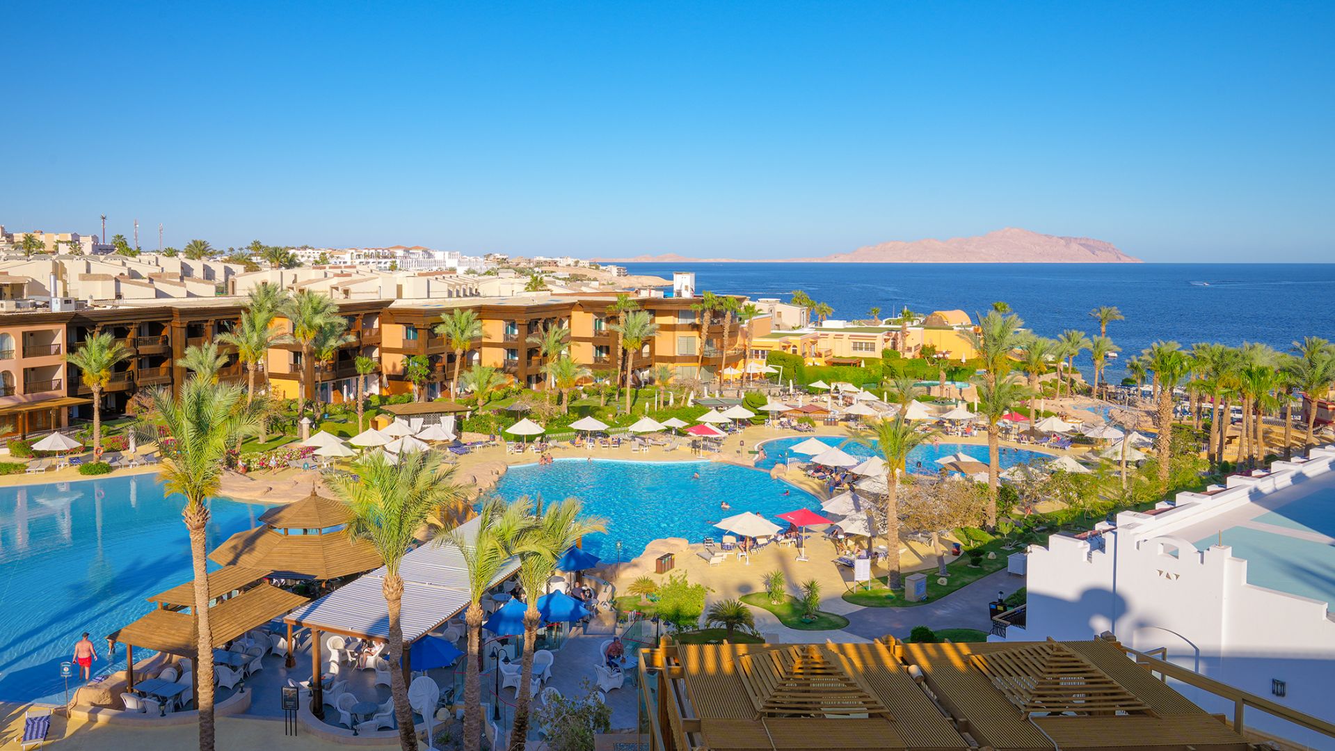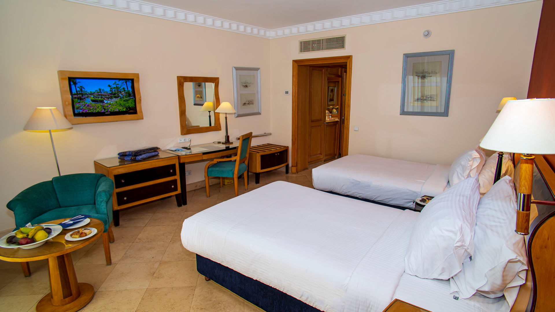Рассчитаны для максимум 2 взрослых и 1 ребенка до 12 лет. - Garden View Rooms — 161 номер площадью от 45 до 50 кв.м, с видом на пышные египетские сады курорта, состоящий из спальни с одной большой кроватью King-size или двумя односпальными кроватями Twin, небольшой гостиной зоны, отделанной мрамором ванной комнаты с ванной и стационарным душем, частной меблированной террасы или балкона с одним диваном и двумя креслами.