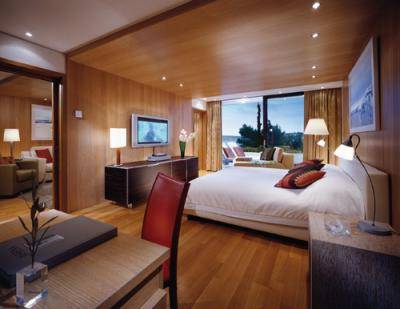 - Deluxe Suites - роскошные люксы с видом на Саронический залив, интерьеры которых украшают картины известных художников. Состоят из спальни с кроватью King size, гостиной и рабочей зоны с письменным столом и удобным диваном, ванной комнаты с двумя раковинами и парной.