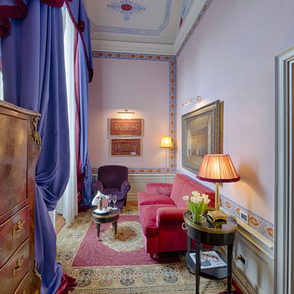 Люкс дополнен второй спальней, также украшенной фресками, с теплыми деревянными полами и кроватью под балдахином темно-синего цвета. Обе спальни имеют элегантные ванные комнаты, отделанные каррарским мрамором и оснащены комплектом эксклюзивных туалетных принадлежностей. - Suite — великолепный номер-люкс, состоящий из двух больших отдельных комнат, спальни и гостиной с удобным диваном и офисной зоной. Имеет великолепный вид на внутренний парк и достопримечательности Флоренции с её холмами. Каждый номер имеет свою историю, непохожую на другие, и неразрывно связан с персонажами, которые на протяжении многих лет и в разные эпохи останавливались там.