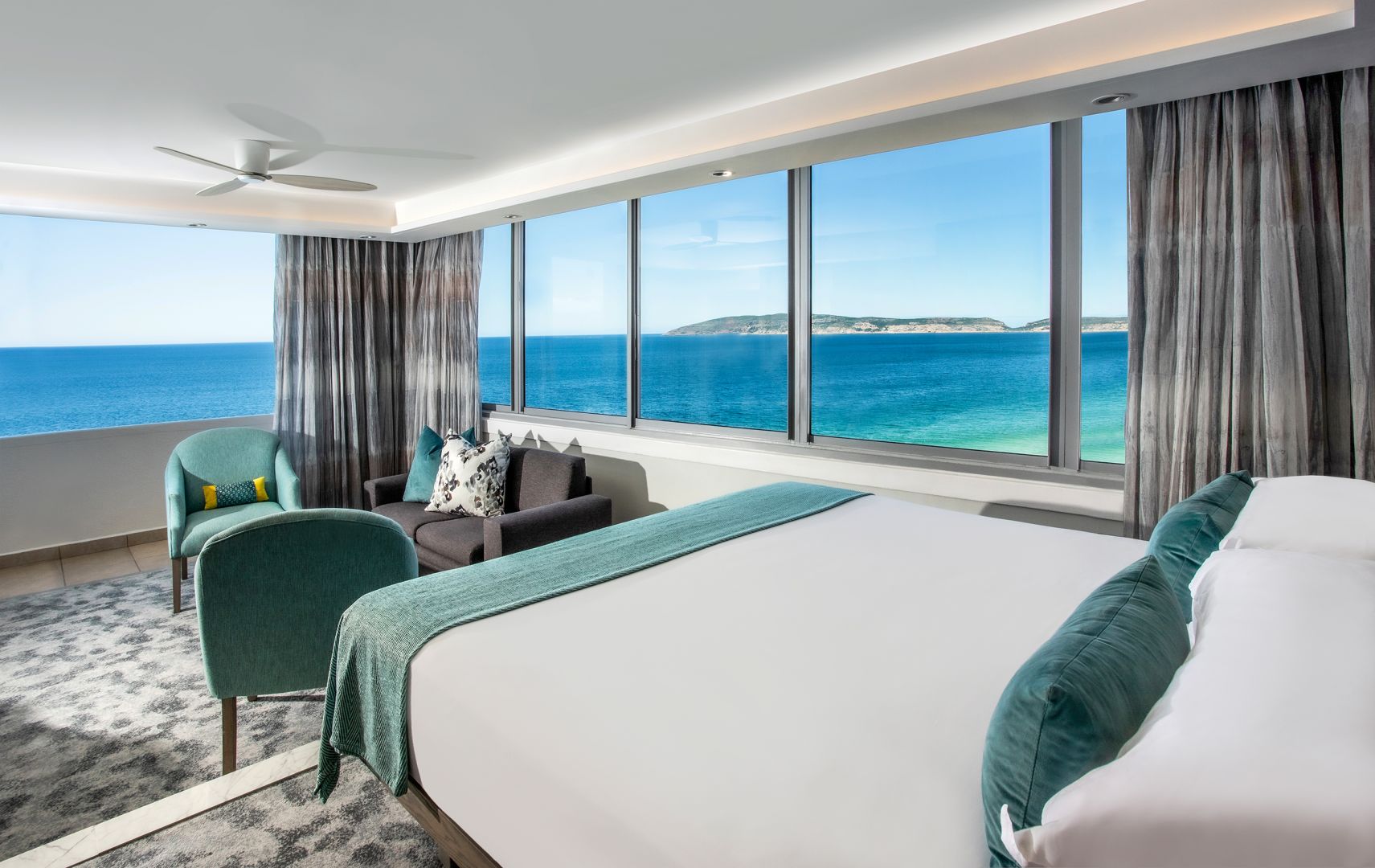 Рассчитаны для максимум 4 гостей: 2 взрослых и 2 детей. - Suites — 8 люксов с подогреваемым полом и прекрасным видом на Индийский океан, состоящих из спальни с большой двуспальной кроватью, отдельной просторной гостиной комнаты с раскладным диваном, рабочей зоны с письменным столом, гардеробной, ванной комнаты с ванной и отдельной душевой кабиной с видом на море, частного меблированного балкона.