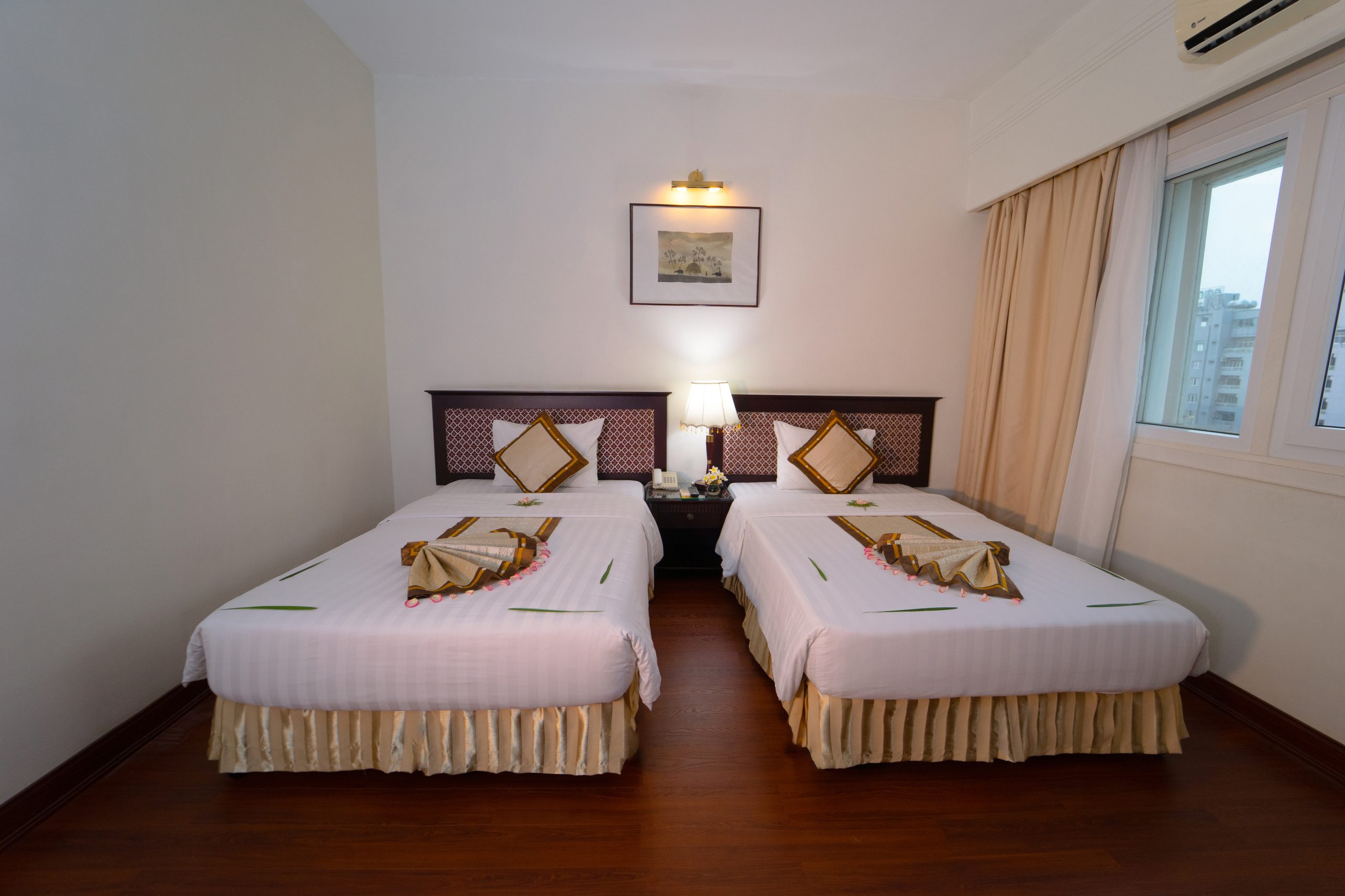 Рассчитаны для максимум 3 гостей. Возможна 1 дополнительная кровать. - Deluxe River View Room — номера площадью 35 кв.м, с паркетным полом и видом на реку, состоящие из спальни с одной двуспальной кроватью Queen-size или двумя отдельными кроватями Twin, уютно обставленной гостиной зоны с деревянной мебелью, ванной комнаты с ванной с душевой лейкой, частного балкона с садовой мебелью и видом на город.
