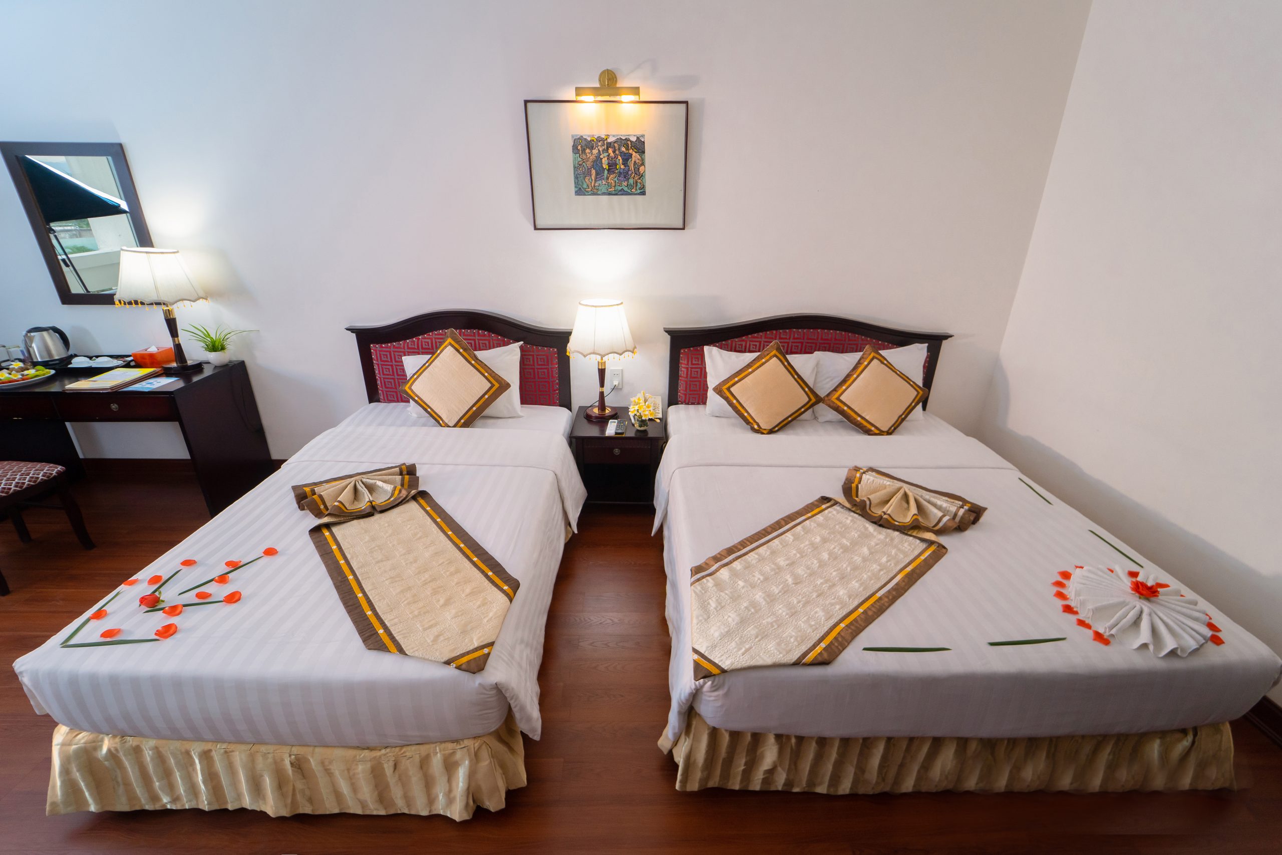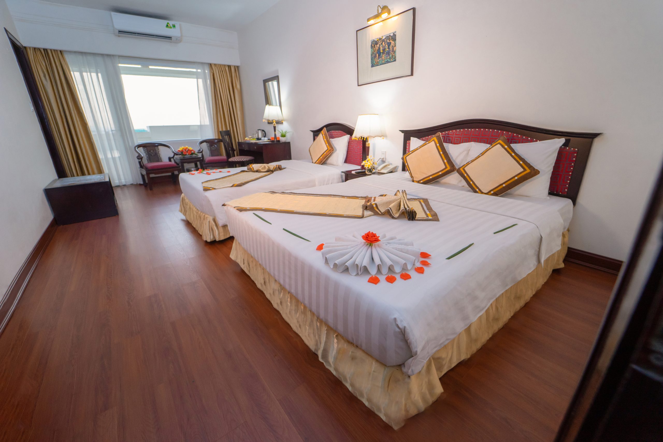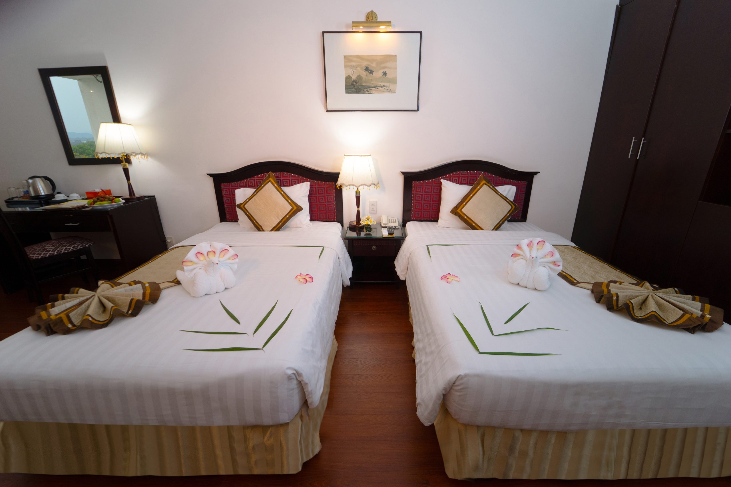 Рассчитаны для максимум 4 гостей. - Deluxe Family Connecting River View Room — семейные номера площадью от 42 кв.м, с паркетным полом и потрясающим видом на реку Парфюм и мост Транг Тьен, состоящие из двух смежных спален со своими гостиными зонами, одна из которых с одной двуспальной кроватью King-size, а вторая — с двумя отдельными кроватями Twin, ванной комнаты с ванной с душевой лейкой, частного балкона с садовой мебелью.