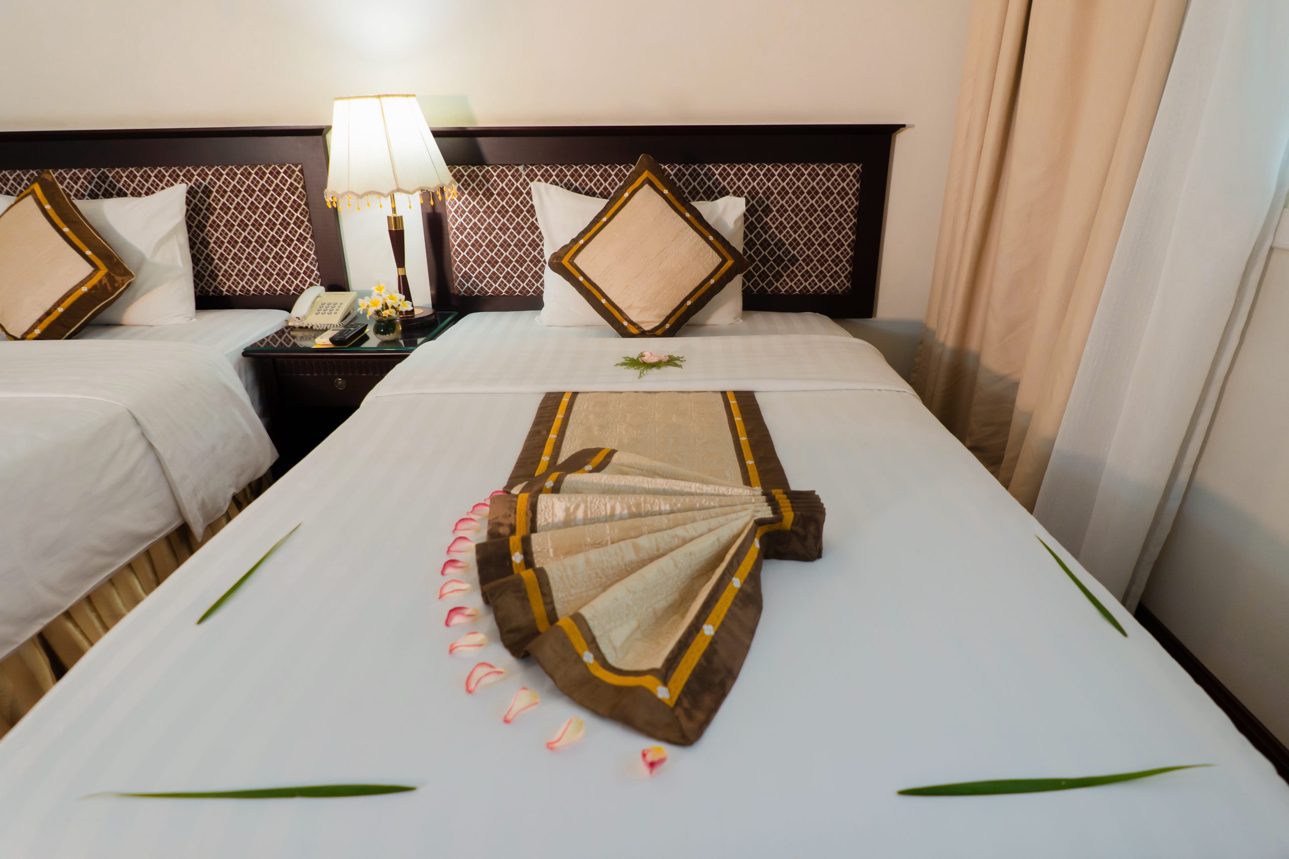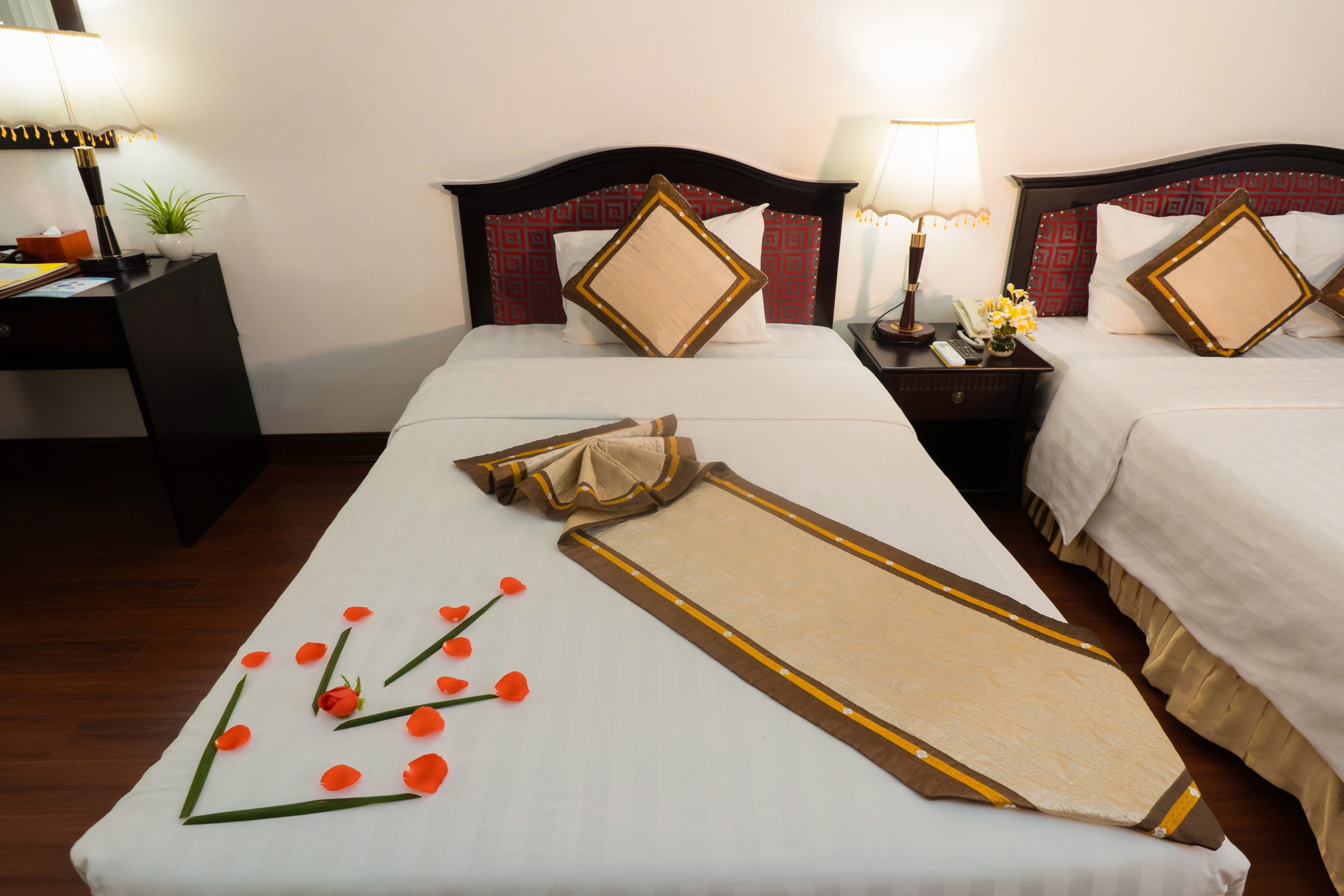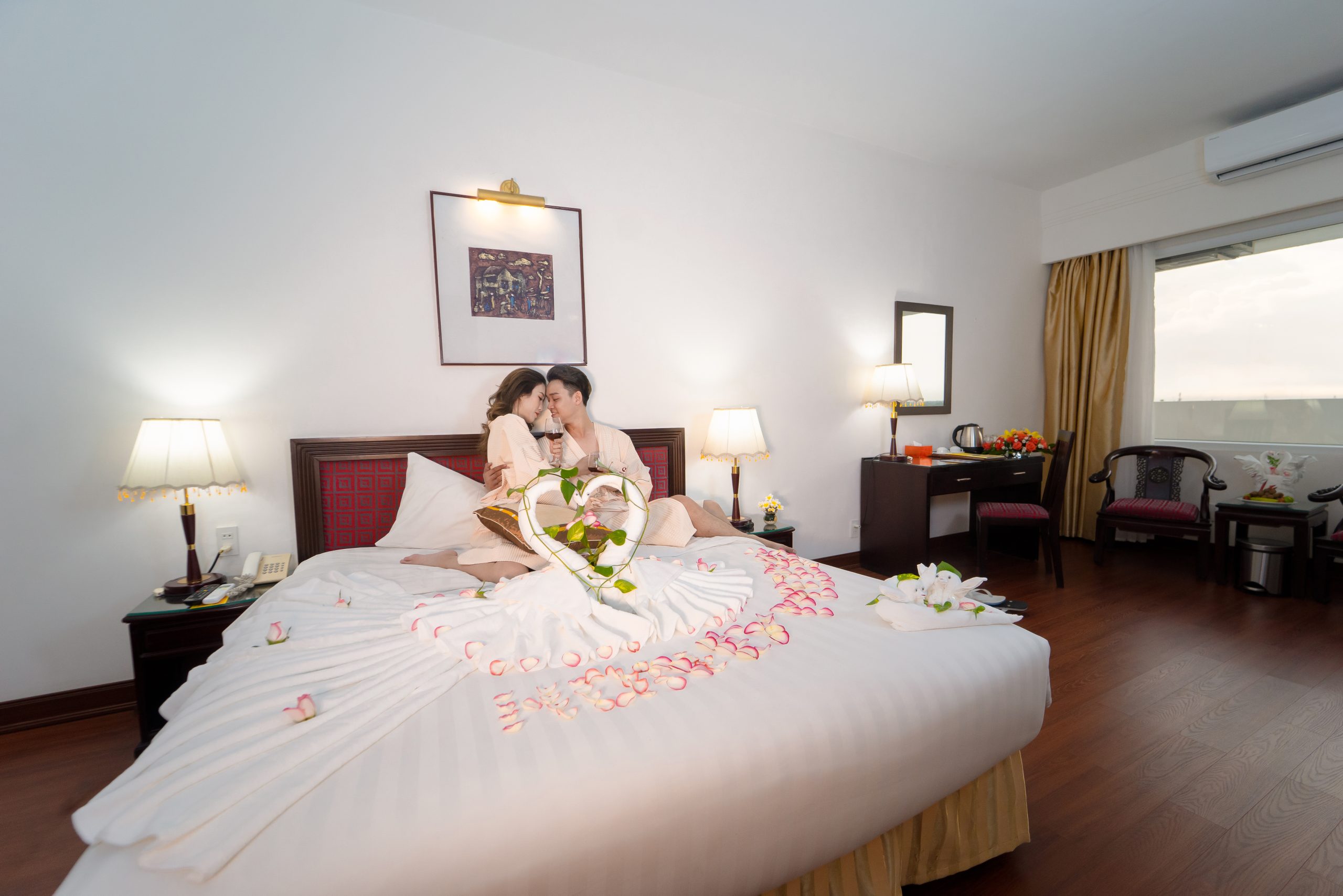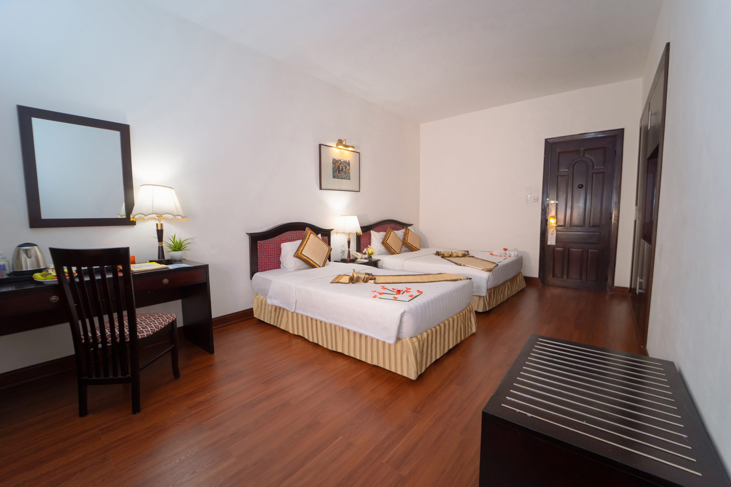 Рассчитаны для максимум 4 гостей. - Deluxe Family Connecting River View Room — семейные номера площадью от 42 кв.м, с паркетным полом и потрясающим видом на реку Парфюм и мост Транг Тьен, состоящие из двух смежных спален со своими гостиными зонами, одна из которых с одной двуспальной кроватью King-size, а вторая — с двумя отдельными кроватями Twin, ванной комнаты с ванной с душевой лейкой, частного балкона с садовой мебелью.