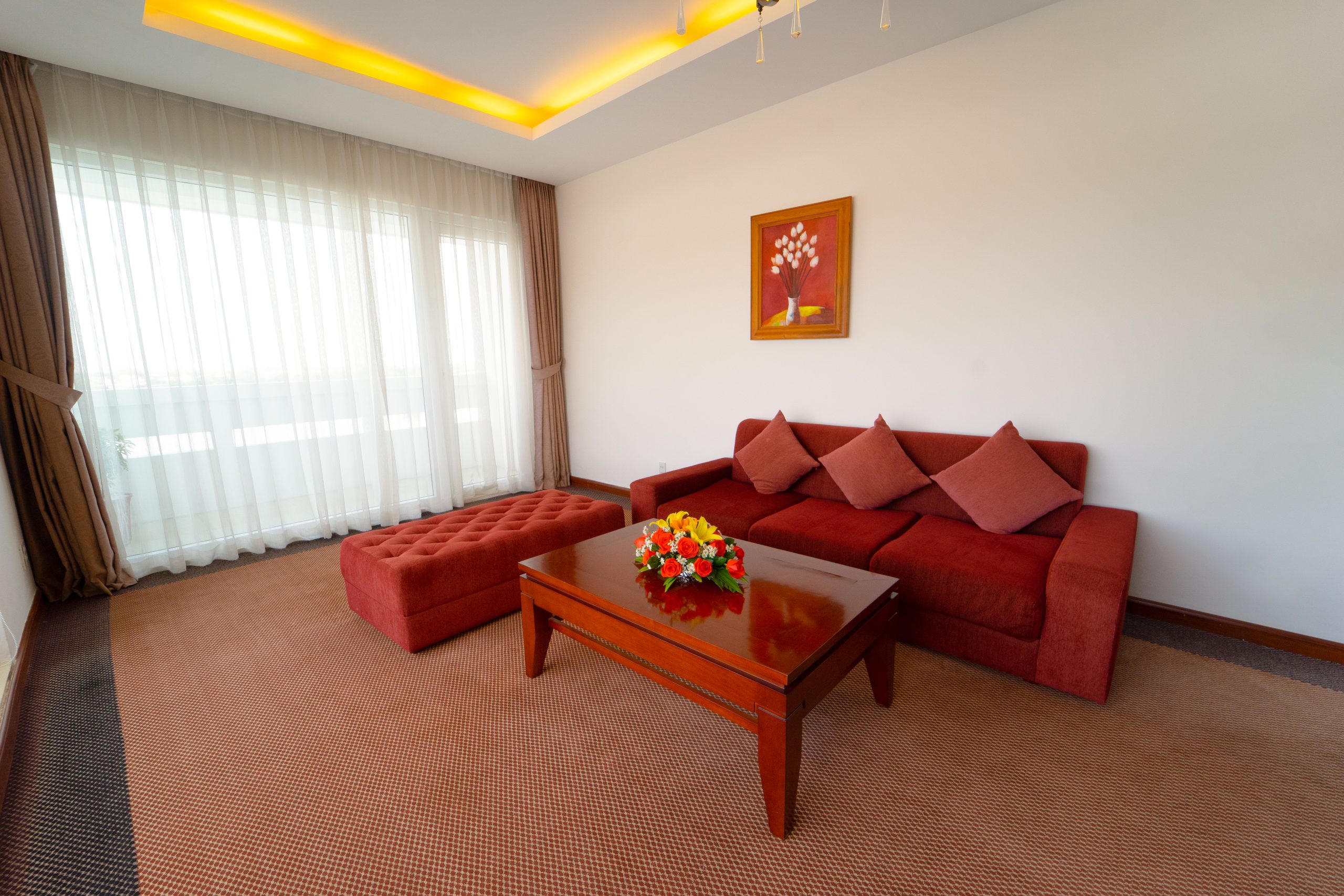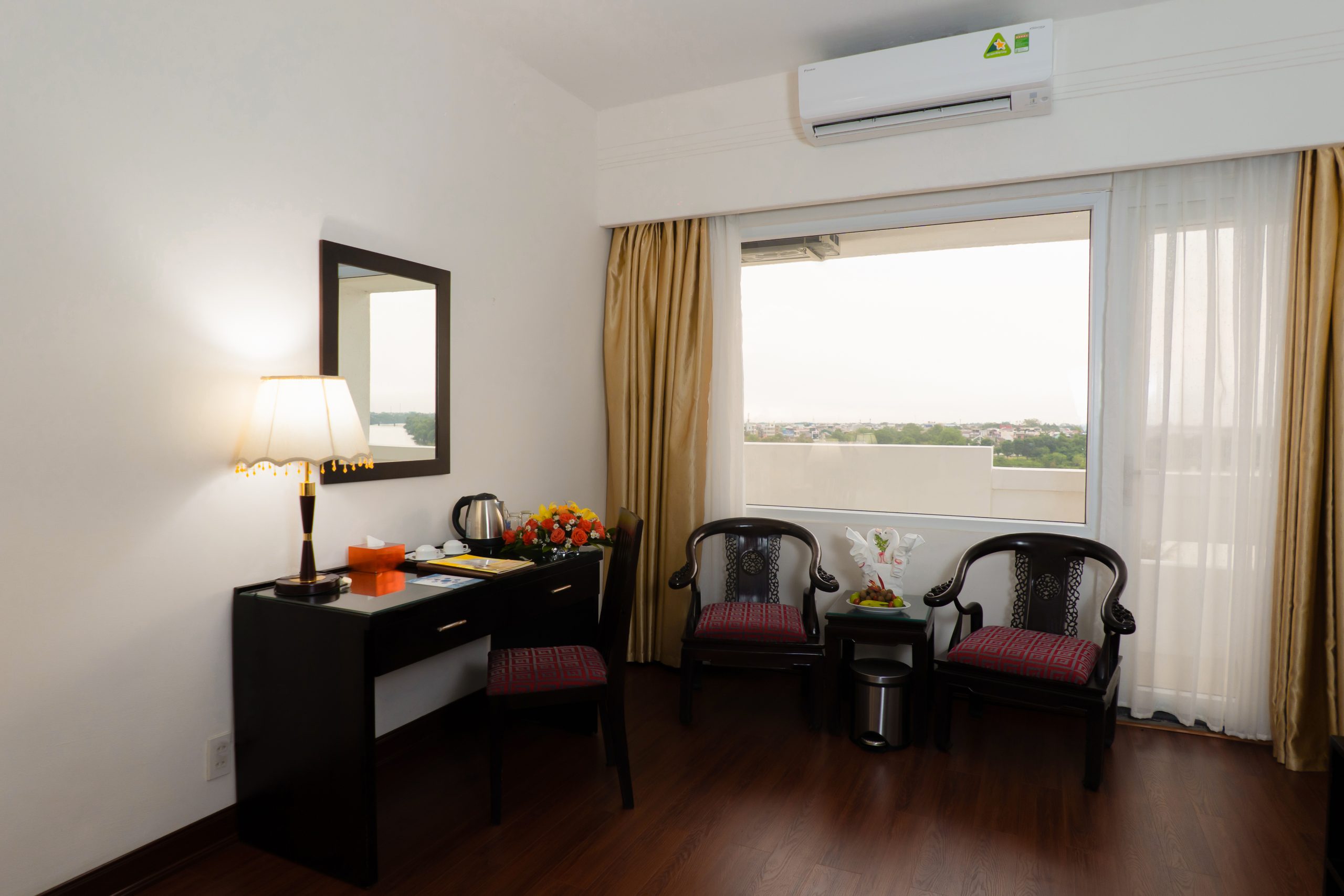 Рассчитан для максимум 3 гостей. Возможна 1 дополнительная кровать. - Premier Suite River View — просторный люкс площадью 72 кв.м с ковровым покрытием и захватывающим панорамным видом на реку Хуонг, состоящий из спальни, отдельной гостиной комнаты с деревянной мебелью и телевизором 42″, двух отдельных ванных комнат с ванной с душевой лейкой, частного балкона с садовой мебелью.