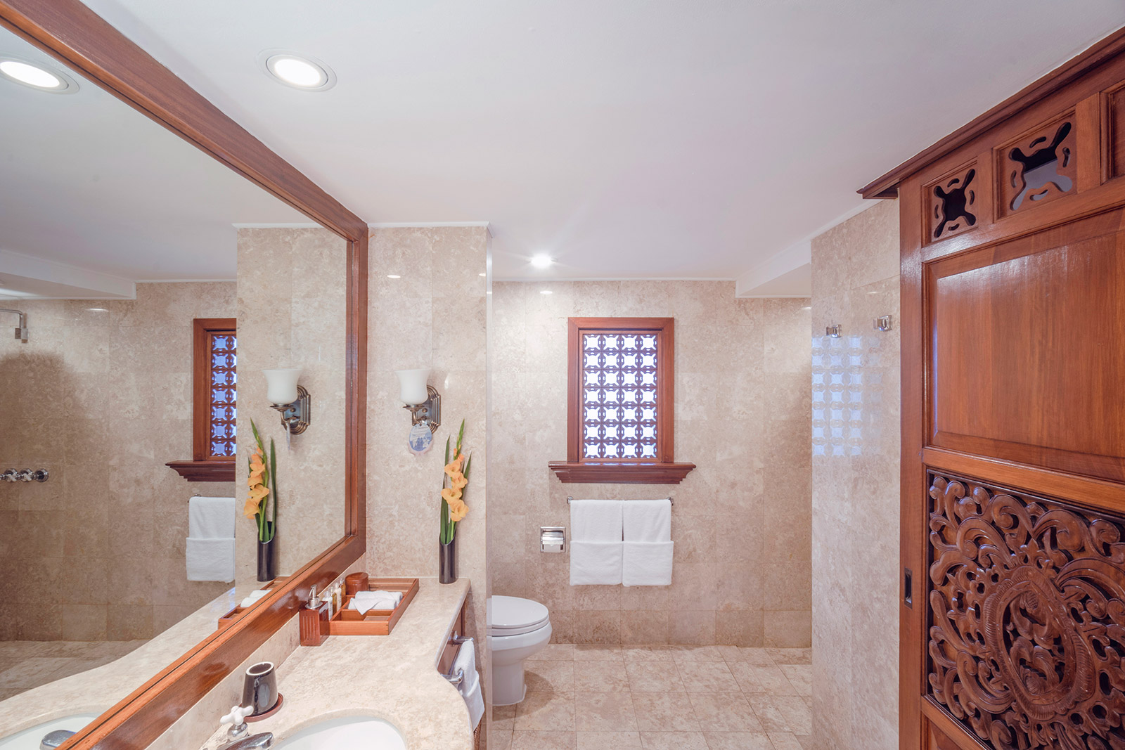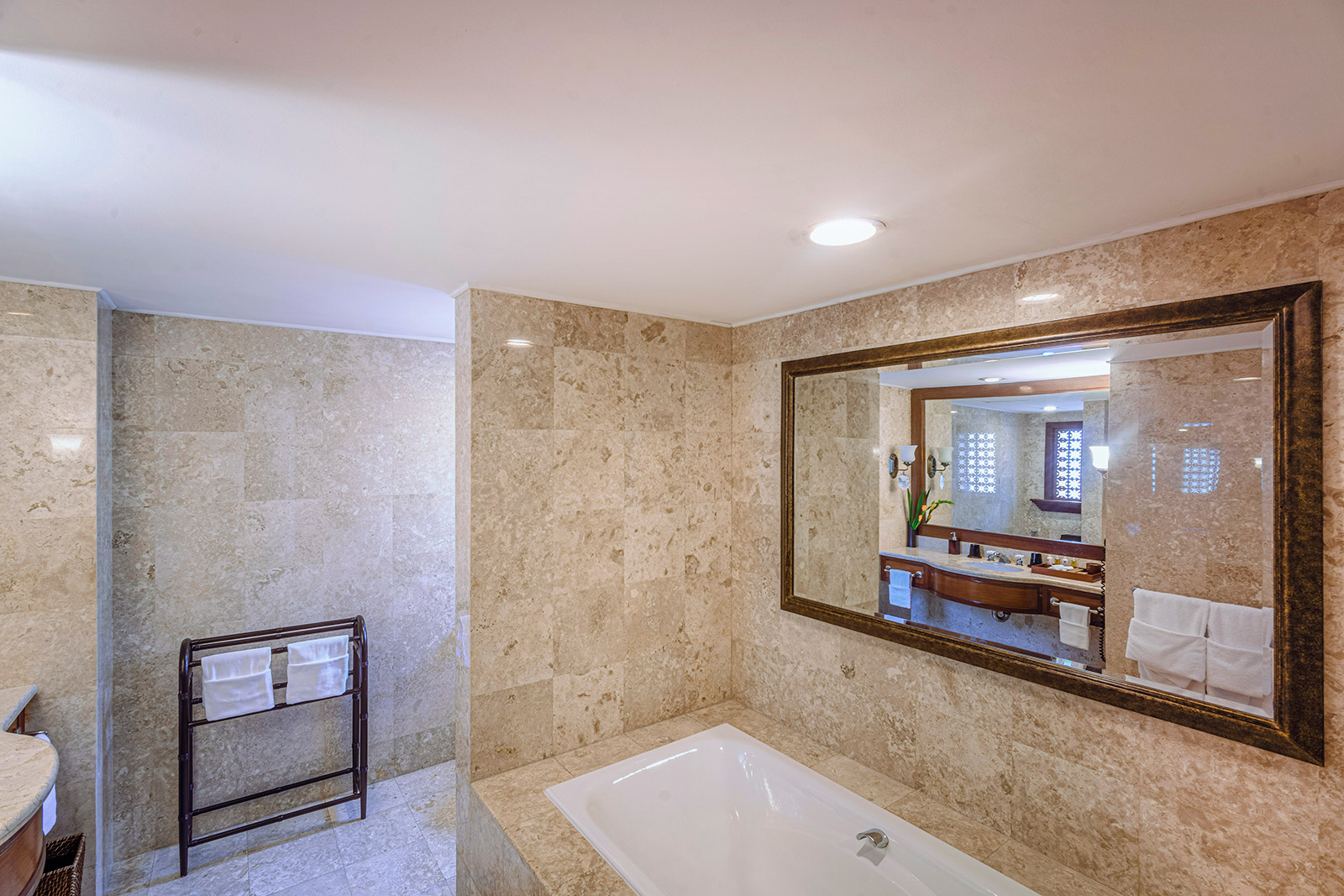 Рассчитаны для максимум 3 взрослых или 2 взрослых и 2 детей. - Ocean Deluxe Room — элегантно оформленные просторные номера площадью 43.7 кв.м, с захватывающим панорамным видом на океан, состоящие из спальни с одной двуспальной кроватью King-size или двумя односпальными кроватями Twin, уютно обставленной гостиной зоны с диваном, рабочей зоны с письменным столом, гардеробной, отделанной мрамором просторной ванной комнаты с ванной и большой душевой кабиной с роскошным душем, просторного частного балкона площадью 11.3 кв.м.