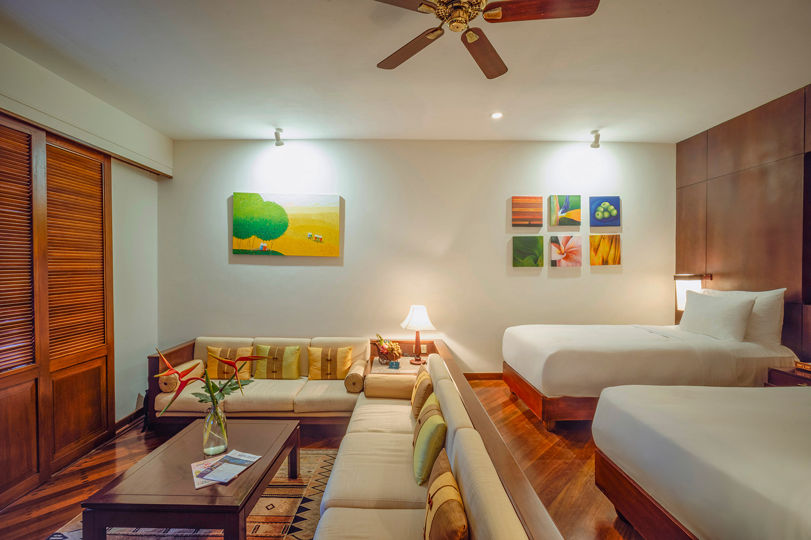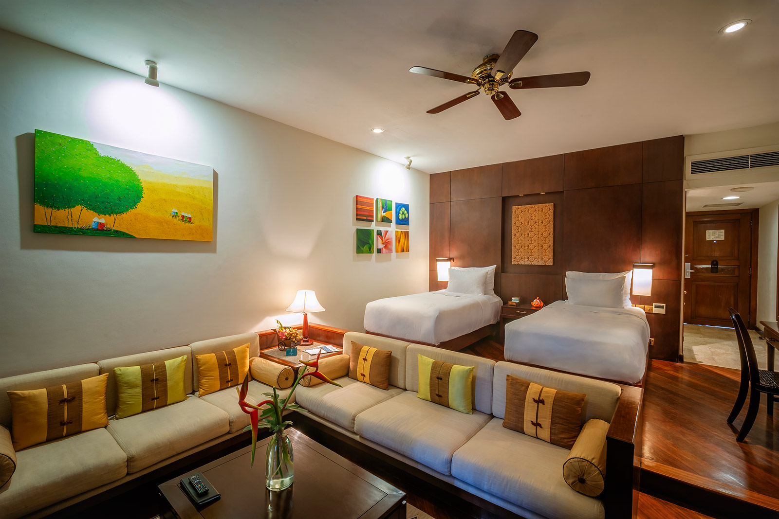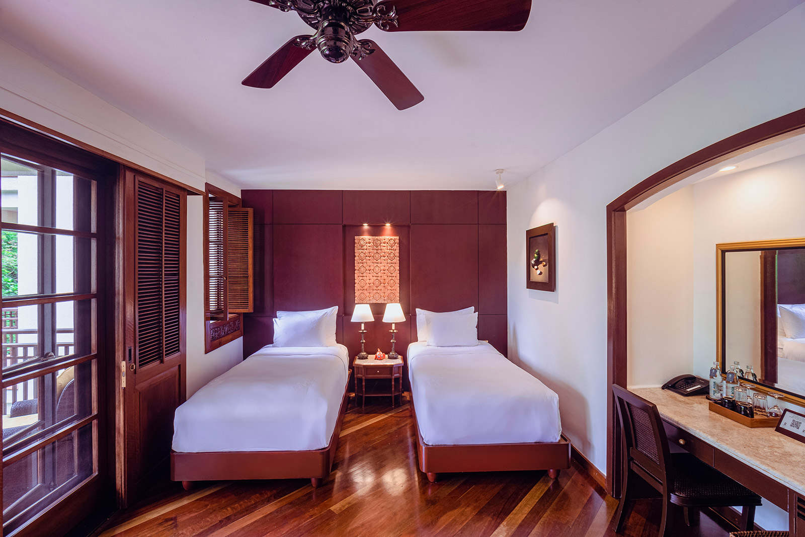 Рассчитан для максимум 3 взрослых или 2 взрослых и 2 детей. - Family Room By Balcony — семейный номер площадью 85.8 кв.м, состоящий из двух смежных номеров с собственными балконами площадью 23 кв.м с живописным видом на пышные сады. Это просторное и комфортное помещение идеально подходит для комфортного размещения семей, позволяя проводить время вместе и предлагая современные удобства и спокойную атмосферу для расслабляющего отдыха. Современные удобства удовлетворят все потребности, гарантируя приятное и удобное пребывание, а вид на тихий сад с балконов создает спокойную атмосферу — идеально для утреннего кофе или вечернего отдыха.