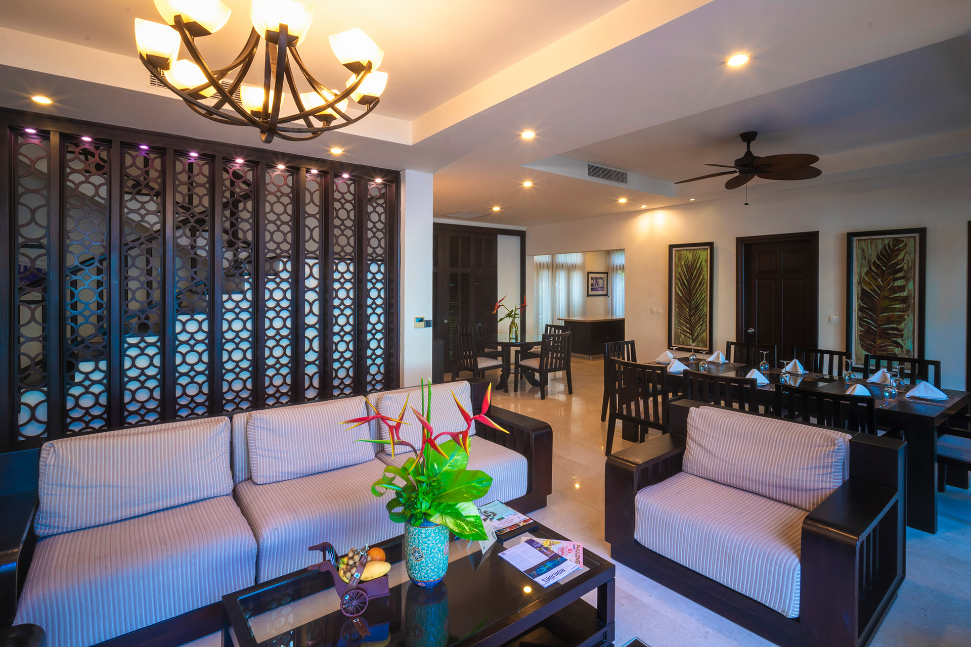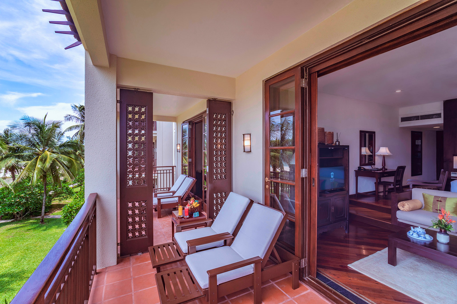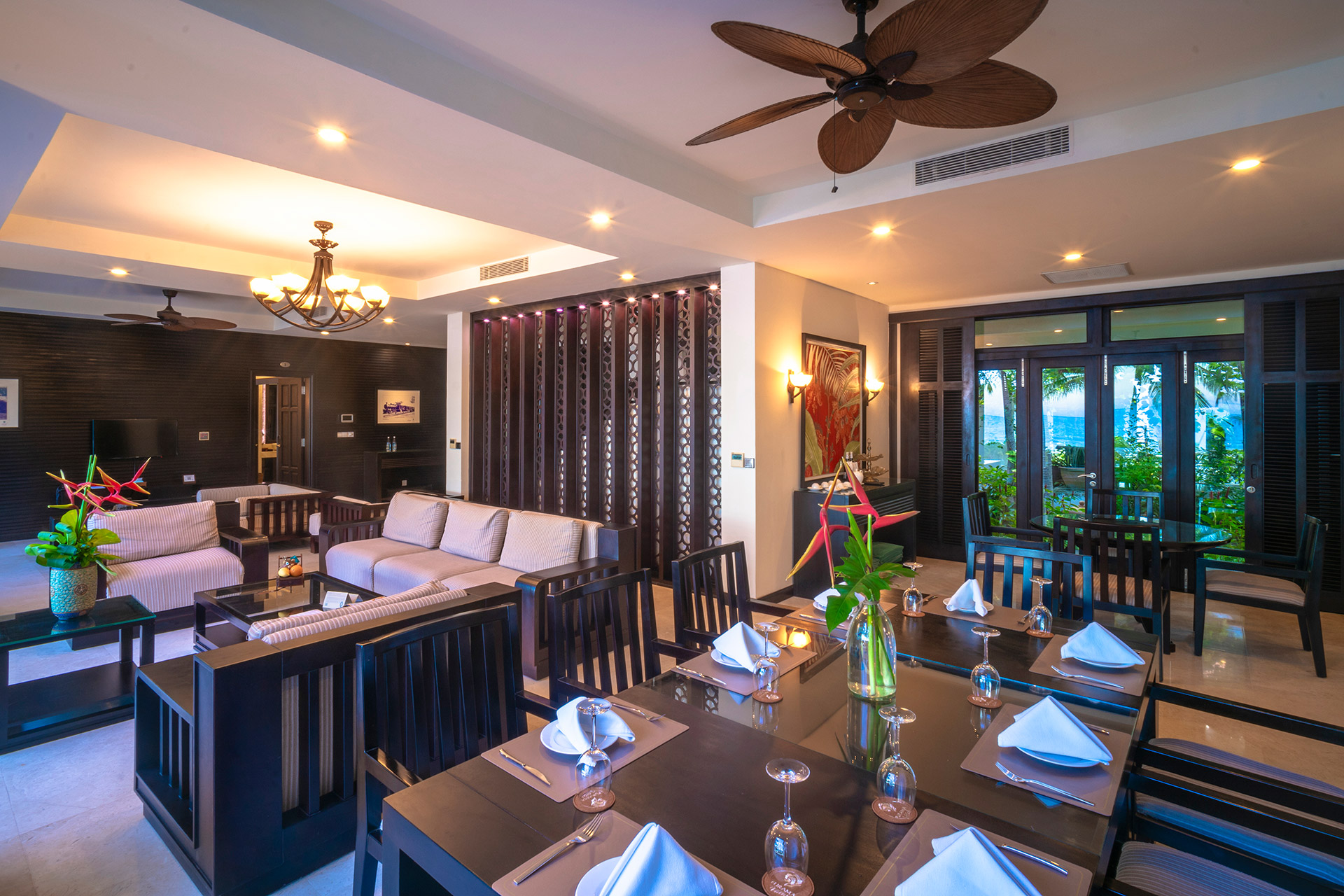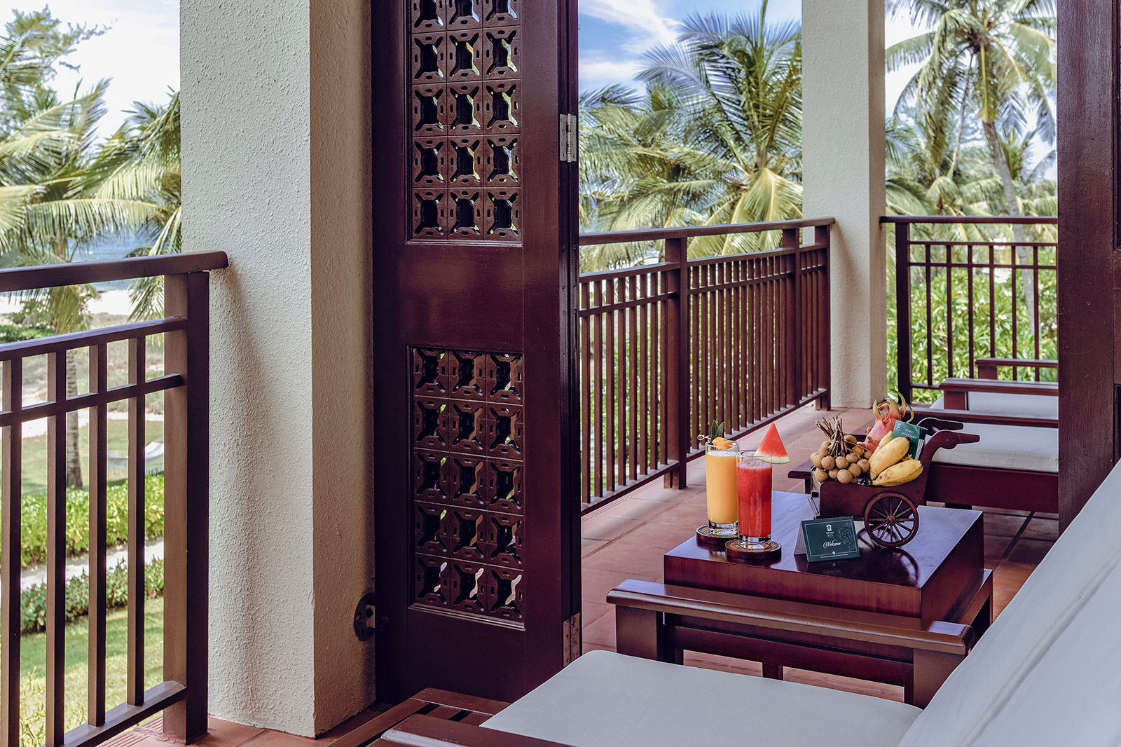 Все номера оснащены полами из полированного дерева, натуральными тканями, удобной мебелью из ротанга и ставнями в колониальном стиле. Каждый номер и вилла имеют собственный балкон или просторную террасу, обеспечивая полную приватность и потрясающий вид на океан, тропические сады или лагунный бассейн с пресной водой. Наслаждайтесь видами на пальмы, растения и цветы самых разнообразных форм и оттенков. Вечером сад и бассейн красиво подсвечиваются, создавая романтичную атмосферу. Изысканное сочетание природных элементов и продуманного дизайна создает безмятежную атмосферу уединения и умиротворения — идеальную для отдыха и восстановления сил.