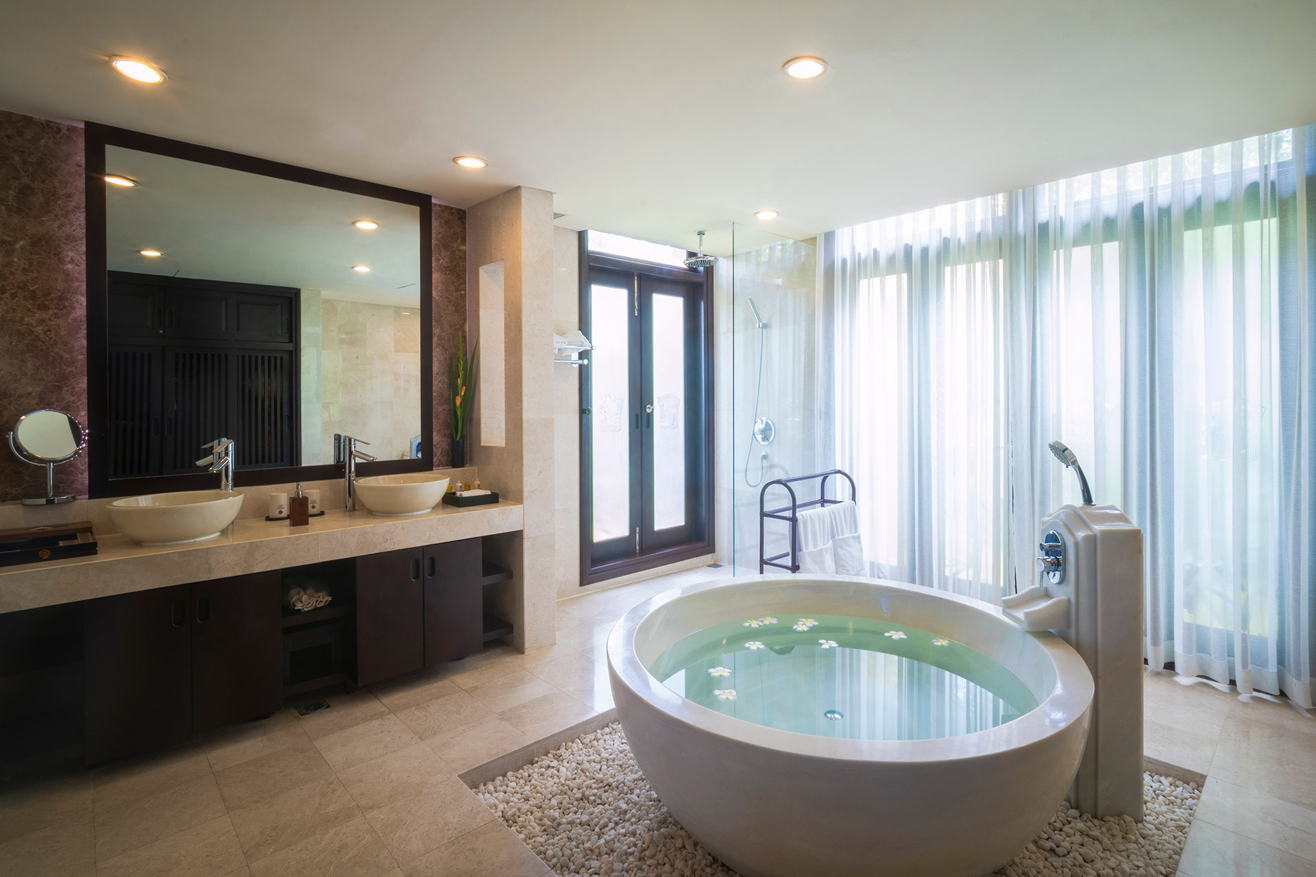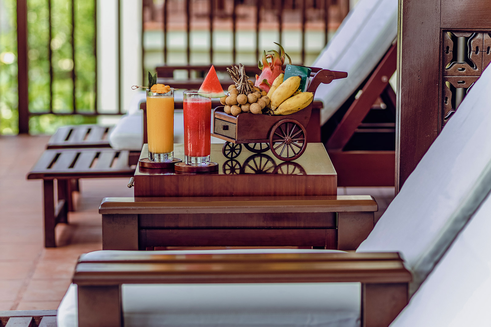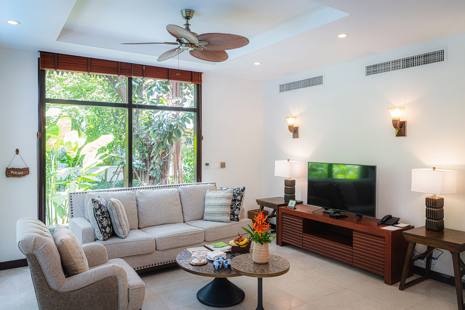 Все номера оснащены полами из полированного дерева, натуральными тканями, удобной мебелью из ротанга и ставнями в колониальном стиле. Каждый номер и вилла имеют собственный балкон или просторную террасу, обеспечивая полную приватность и потрясающий вид на океан, тропические сады или лагунный бассейн с пресной водой. Наслаждайтесь видами на пальмы, растения и цветы самых разнообразных форм и оттенков. Вечером сад и бассейн красиво подсвечиваются, создавая романтичную атмосферу. Изысканное сочетание природных элементов и продуманного дизайна создает безмятежную атмосферу уединения и умиротворения — идеальную для отдыха и восстановления сил.