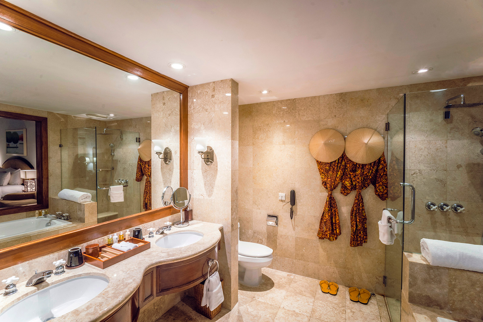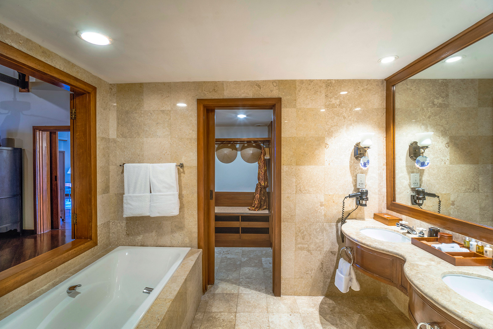 Рассчитаны для максимум 3 взрослых или 2 взрослых и 2 детей. - Garden Deluxe Room — окруженные пышной зеленью просторные номера площадью 43.7 кв.м, с очаровательными видами на тропические сады, где обитает более 30 видов птиц, состоящие из спальни с одной двуспальной кроватью King-size или двумя односпальными кроватями Twin, уютно обставленной гостиной зоны с диваном, рабочей зоны с письменным столом, гардеробной, отделанной мрамором просторной ванной комнаты с ванной и большой душевой кабиной с роскошным душем, просторного частного балкона площадью 11.3 кв.м.