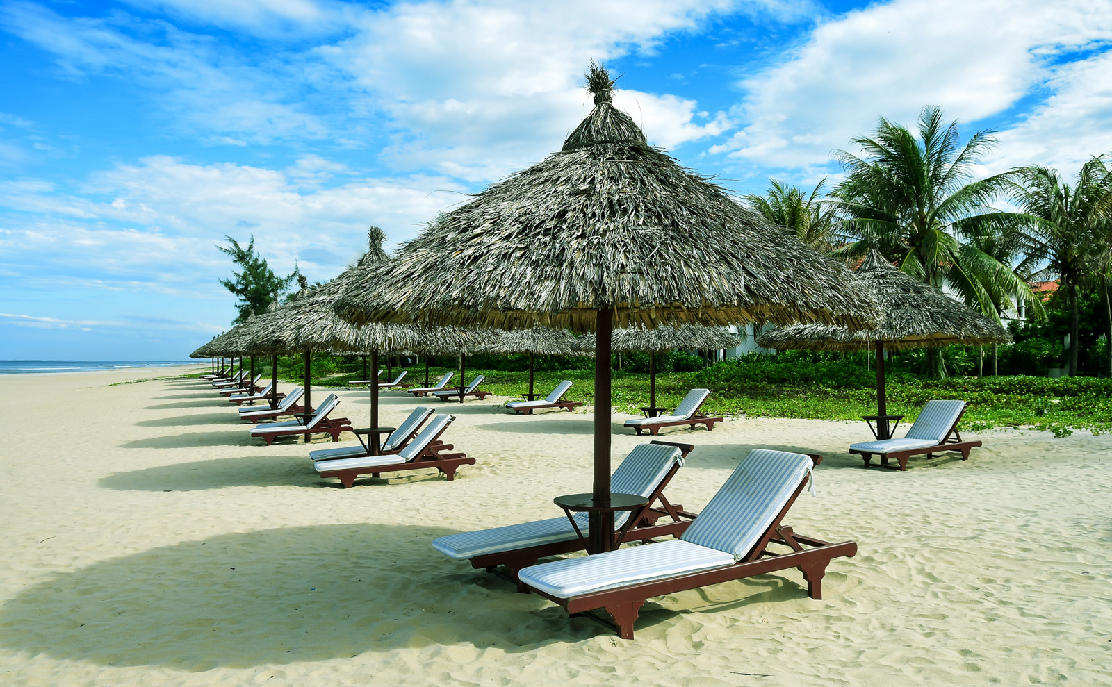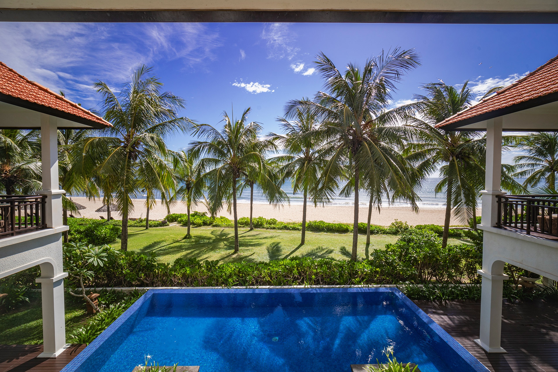 Прекрасный комплекс вилл с 2–4 спальнями, частными бассейнами, полностью оборудованной кухней, имеют выход к пляжу или в ухоженные сады. Крыши из красной черепицы придают виллам неповторимый азиатский колорит, вдохновленный архитектурой Чампы, королевских храмов и дворцов, а роскошные интерьеры с отделкой из дерева и мрамора и ультрасовременные удобства делают пребывание на виллах максимально комфортным.
