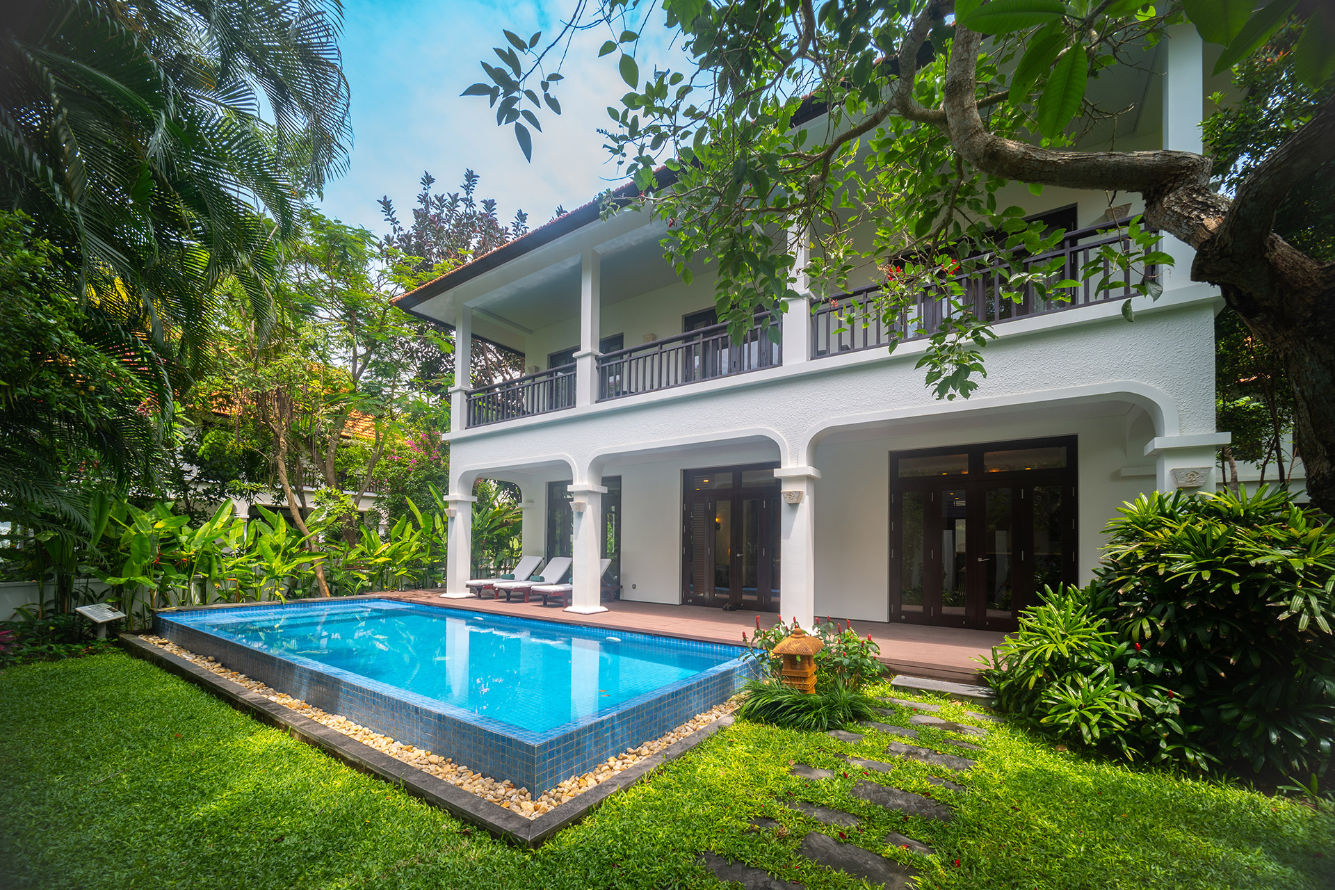 Рассчитаны для максимум 8 гостей. - Three Bedroom Pool Villa — элегантные и просторные виллы площадью от 315 до 380 кв.м, сочетающие в себе французскую колониальную архитектуру и традиционный вьетнамский дизайн, а также комфорт и природную красоту, даря незабываемые впечатления и безмятежный отдых среди пышных садов.