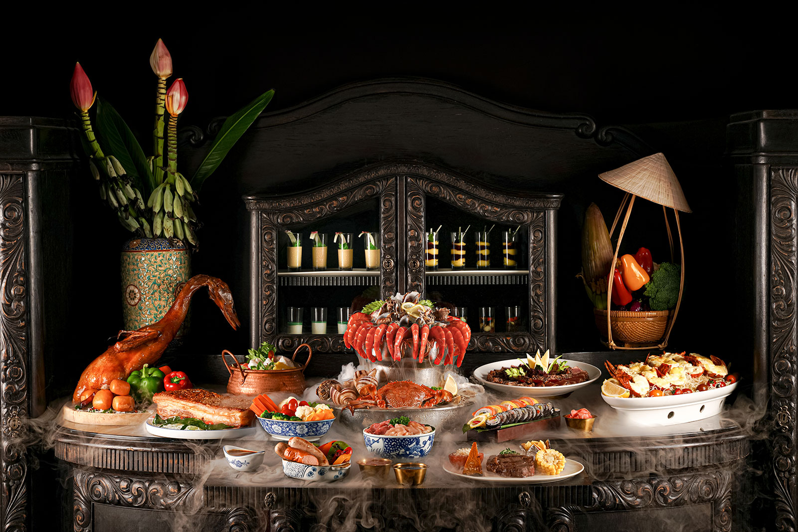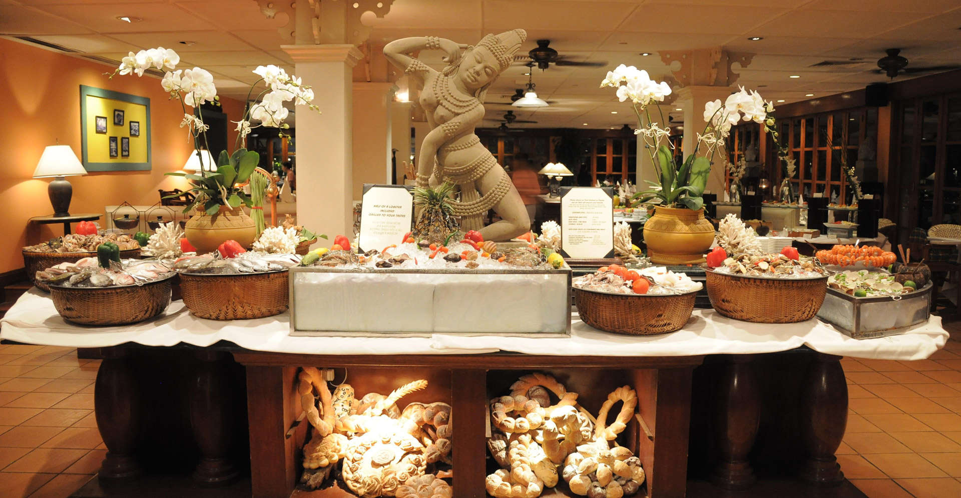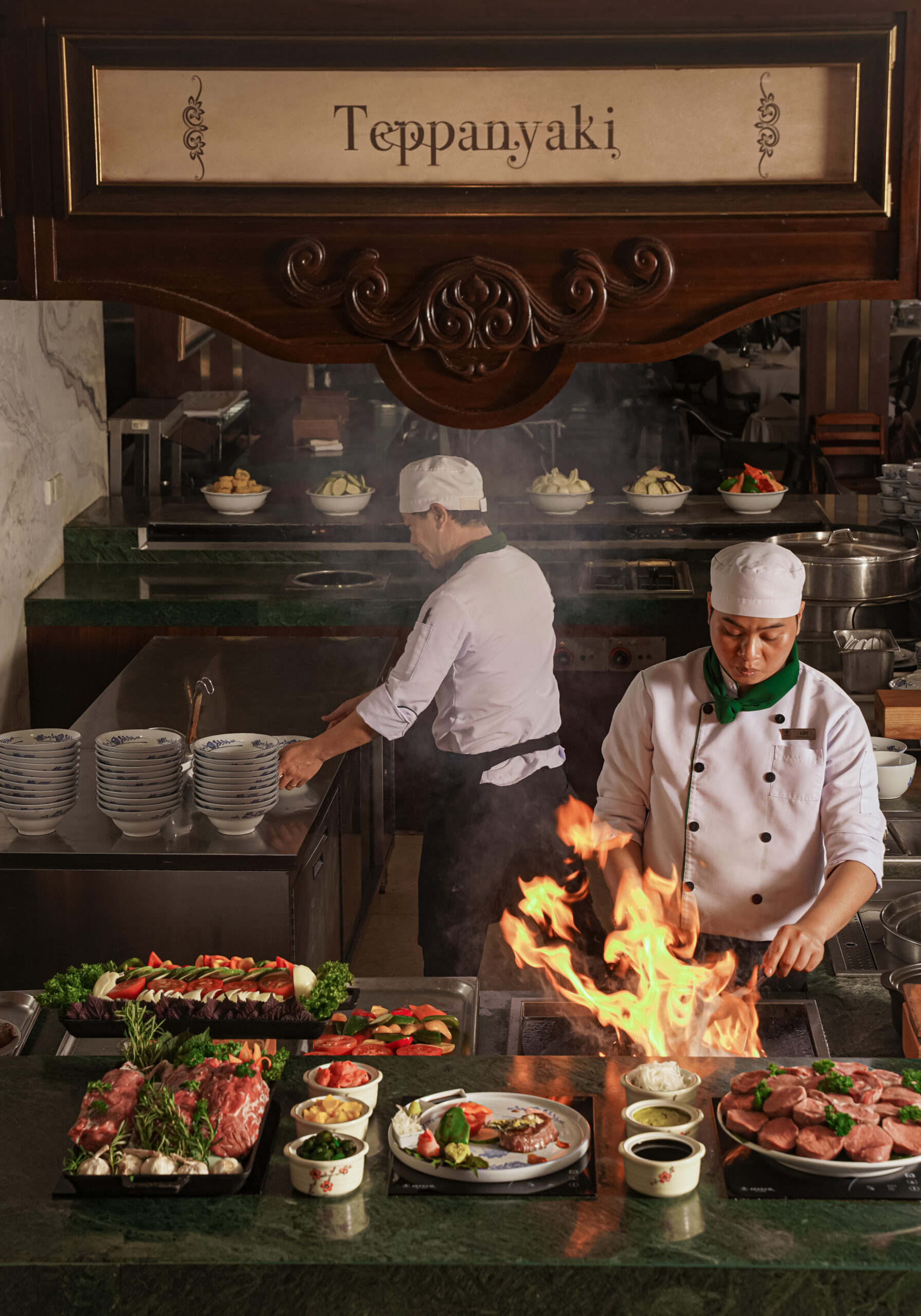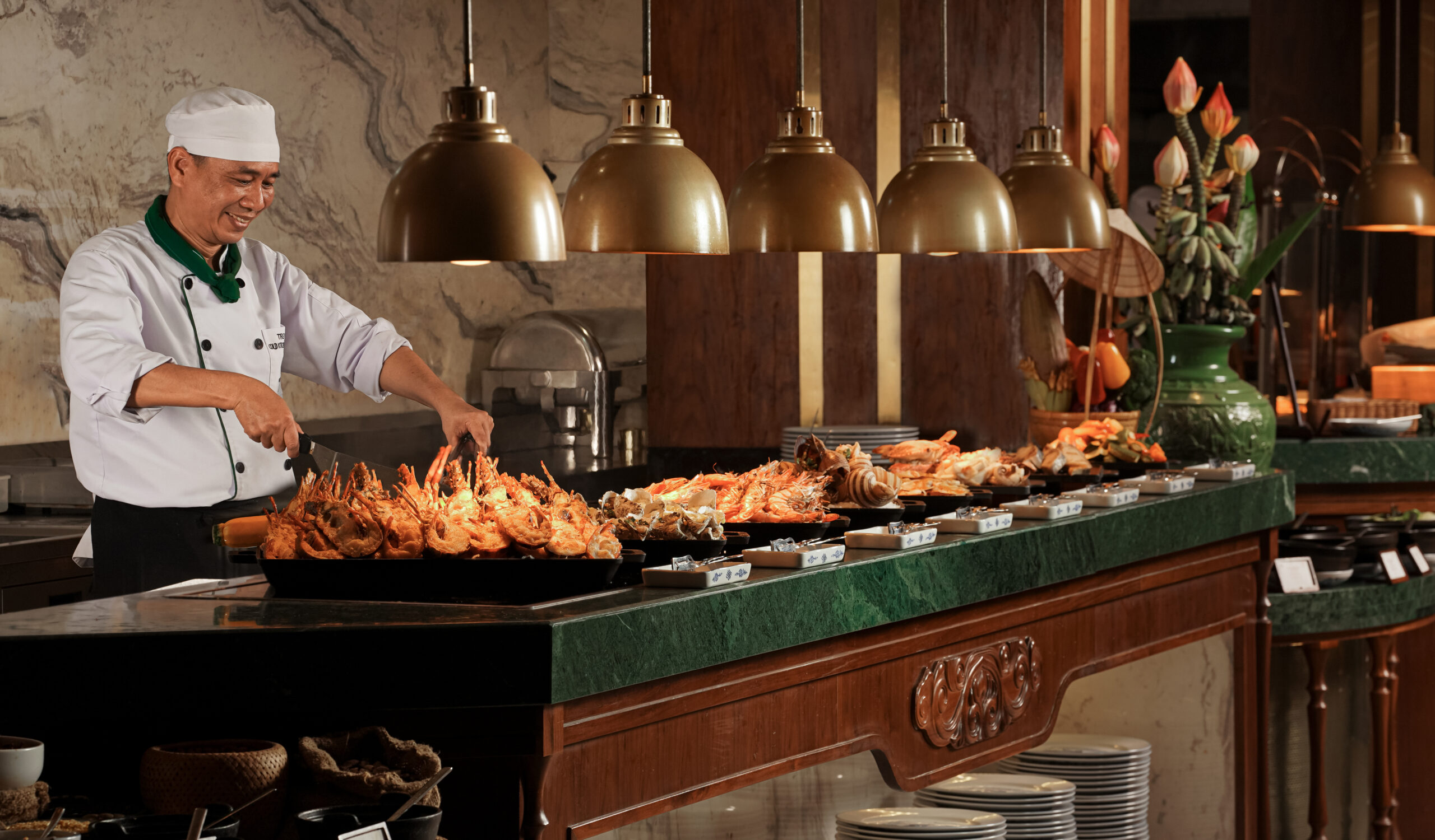 Café Indochine также славится своим ужином-буфетом ‘Морепродукты и стейки’, где подают омар из Нячанга, приготовленный по вкусу гостя, морепродукты из Дананга ‘от океана к столу’, премиальные стейки в стиле тепаньяки, и более 70 фирменных блюд, приготовленных прямо на глазах гостей в шоу-кухне.