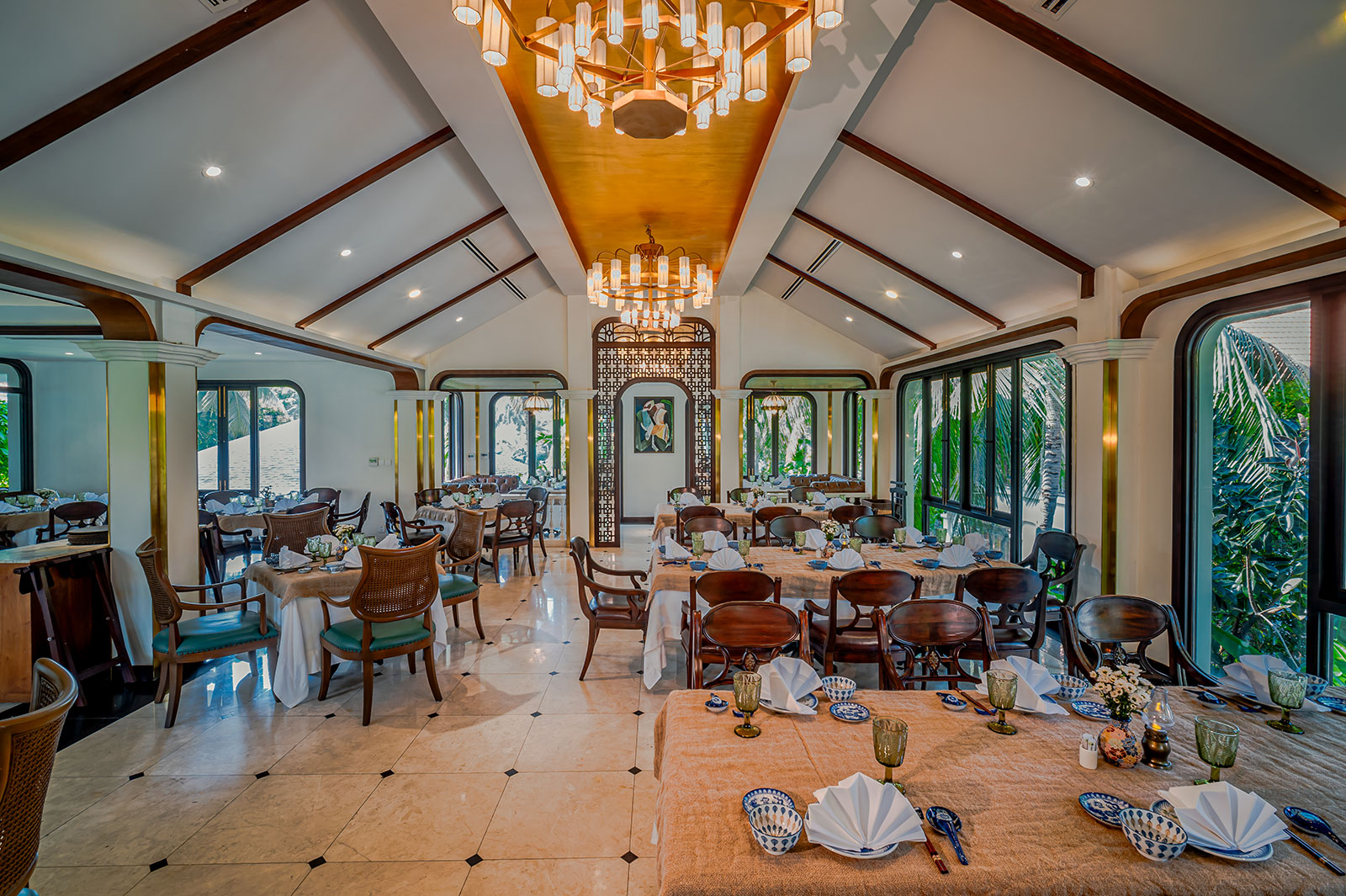 — Danang Ballroom 1&2, 2&3 площадью 516 кв.м - The Ocean Ballroom — расположенный на верхнем этаже главного павильона зал площадью 363 кв.м, в котором могут разместиться от 70 до 450 человек.