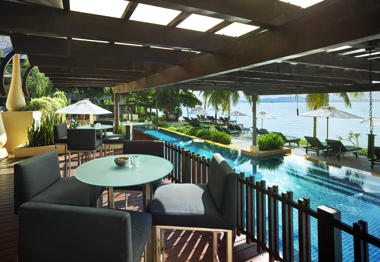 Pool Bar & Lounge — уютный бар и лаунж на открытом воздухе с видом на тихий пейзажный бассейн курорта и плавучие беседки-кабаны, идеально подходящий для отдыха после купания или непринужденного ланча. Вечерами наслаждайтесь коктейлями и легкими закусками, наблюдая за закатом над горой Кинабалу.