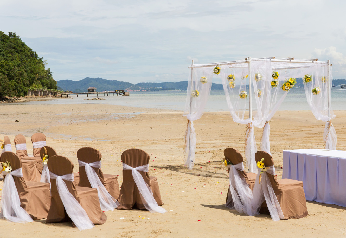 На фоне возвышающихся вершин великолепной горы Кинабалу на курорте Gaya Island Resort рождаются захватывающие дух моменты и воспоминания на всю жизнь. Расположенный среди зеленого тропического леса, этот современный курорт гармонично вписывается в окружающую среду, воплощая классические элементы дизайна Сабаха, предлагая умиротворяющую обстановку для незабываемой свадебной церемонии: