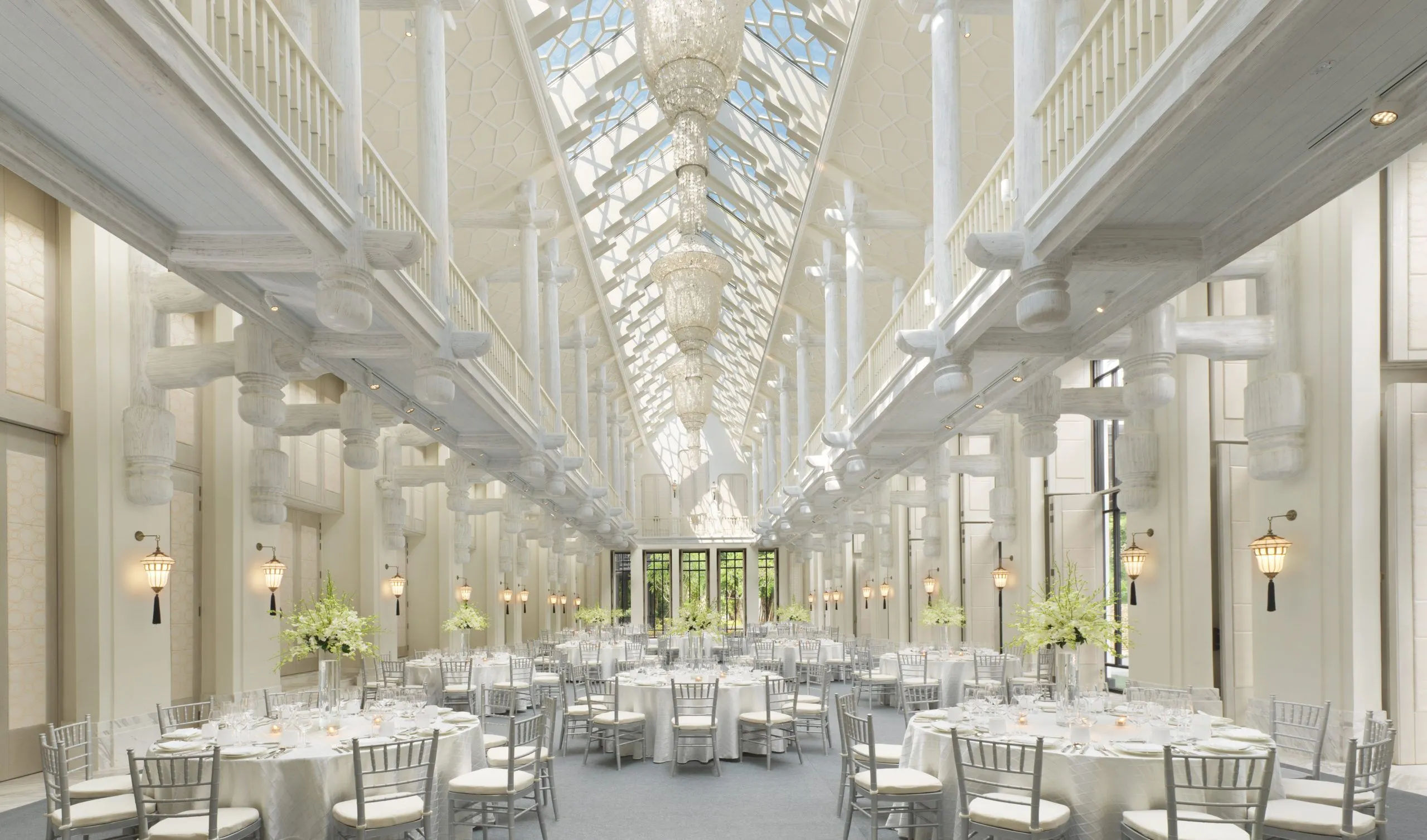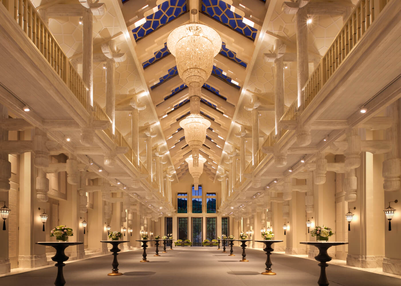 Зал для приемов идеально подходит для торжественных мероприятий и свадеб благодаря атмосфере, напоминающей собор. С заходом солнца он превращается в идеальное место для элегантных торжеств и презентаций новых продуктов.